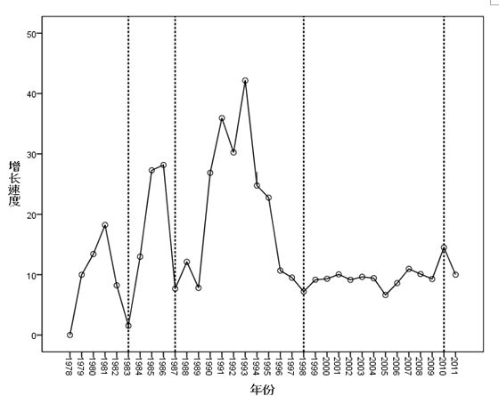經(jīng)濟運行過程中,增長是與周期波動相伴隨的,而經(jīng)濟增長的波動是以國內(nèi)(地區(qū))生產(chǎn)總值的發(fā)展速度波動為主要標(biāo)志。通過對改革開放以來開平市生產(chǎn)總值的增長速度運用經(jīng)濟增長的“谷—谷”法來劃分經(jīng)濟周期,研究我市經(jīng)濟發(fā)展的軌跡。經(jīng)研究發(fā)現(xiàn),我市已經(jīng)經(jīng)歷了四個經(jīng)濟周期(見圖3)。