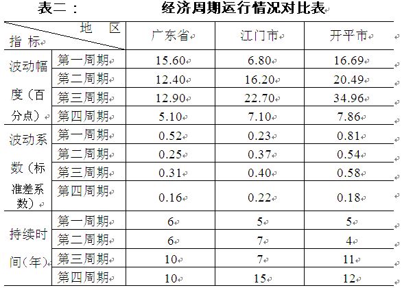 我市經(jīng)濟周期呈現(xiàn)前快后穩(wěn)的總體特征。我市經(jīng)濟在改革開放初期發(fā)展較快,在第一周期快起快落,波動系數(shù)達0.812,在第二周期后表現(xiàn)更為快速,歷時4年完成峰谷位交替,但波動系數(shù)下降到0.54;第三周期則受鄧小平同志南巡以及撤縣設(shè)市帶動一大批重點項目投入上馬等促進,波動系數(shù)比第二周期上升0.044,達0.584;在第四周期的發(fā)展,則有所放緩但表現(xiàn)平穩(wěn),波動系數(shù)下降到0.179。具體見表一和表二: