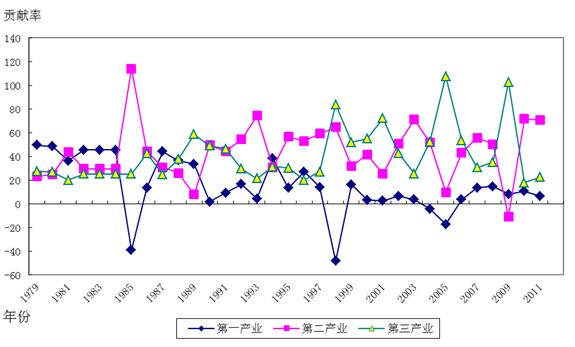 1978—2011年,開平市三次產(chǎn)業(yè)對生產(chǎn)總值的貢獻率均值分別是:第一產(chǎn)業(yè)15.22%、第二產(chǎn)業(yè)43.95%、第三產(chǎn)業(yè)40.83%,具體表現(xiàn)如下:第一產(chǎn)業(yè)對經(jīng)濟的貢獻由高到低發(fā)展。在改革開放初期對經(jīng)濟的貢獻達40%以上,由1985年開始呈波動向下發(fā)展至2011年其貢獻率只有6.5%;第二產(chǎn)業(yè)對經(jīng)濟的貢獻由小到大。其在改革開放初期的貢獻率只有20%左右,但隨著改革開放的深入推進,尤其在工業(yè)經(jīng)濟的快速發(fā)展推動下逐漸成為主導(dǎo)產(chǎn)業(yè),2011年對經(jīng)濟的貢獻率達70.94%;第三產(chǎn)業(yè)對經(jīng)濟的貢獻波動不穩(wěn)。在改革開放三十多年中,第三產(chǎn)業(yè)呈與第二產(chǎn)業(yè)互補交替的合力之勢對經(jīng)濟發(fā)展作出貢獻。具體見圖4: