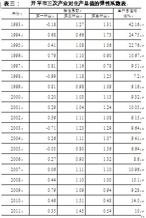 以開平市1993年—2011年的三次產(chǎn)業(yè)的增長速度,計算出其對生產(chǎn)總值增長的彈性系數(shù),計算結(jié)果是:第一產(chǎn)業(yè)的彈性系數(shù)較??;第二產(chǎn)業(yè)的彈性系數(shù)高且較穩(wěn)定;第三產(chǎn)業(yè)的彈性系數(shù)整體較高,但在2006年開始受金融風(fēng)暴影響對經(jīng)濟的彈性系數(shù)逐步下降。具體見表三: