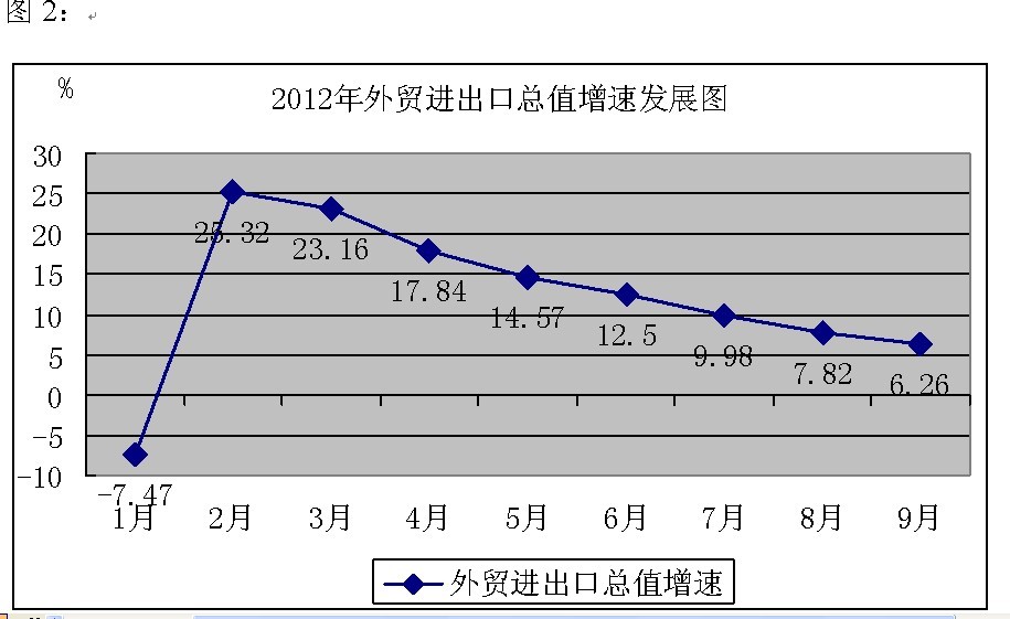 進(jìn)出口方面。從年初開始,我市的進(jìn)出口總值增幅就一直走下坡路,至9月份止,我市實(shí)現(xiàn)進(jìn)出口總值16.08億美元,同比增長(zhǎng)6.26%,比第二季度回落6.24個(gè)百分點(diǎn)、比第一季度回落16.9個(gè)百分點(diǎn)。見下圖2: