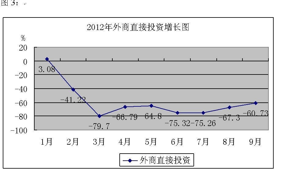 受當(dāng)前經(jīng)濟(jì)形勢(shì)的影響,我市經(jīng)濟(jì)在經(jīng)歷前段時(shí)間的波動(dòng)后,在第三季度的各項(xiàng)指標(biāo)有升有降,有向上發(fā)展呈回穩(wěn)態(tài)勢(shì)的,也有發(fā)展末如理想的。具體情況如下: 外商直接投資方面。1—9月份,我市實(shí)際利用外商直接投資4703萬美元,只完成年度任務(wù)39.82%,同比下降60.73%,已連續(xù)8個(gè)月在負(fù)增長(zhǎng)里徘徊。見圖3: (三)園區(qū)經(jīng)濟(jì)進(jìn)入發(fā)展期