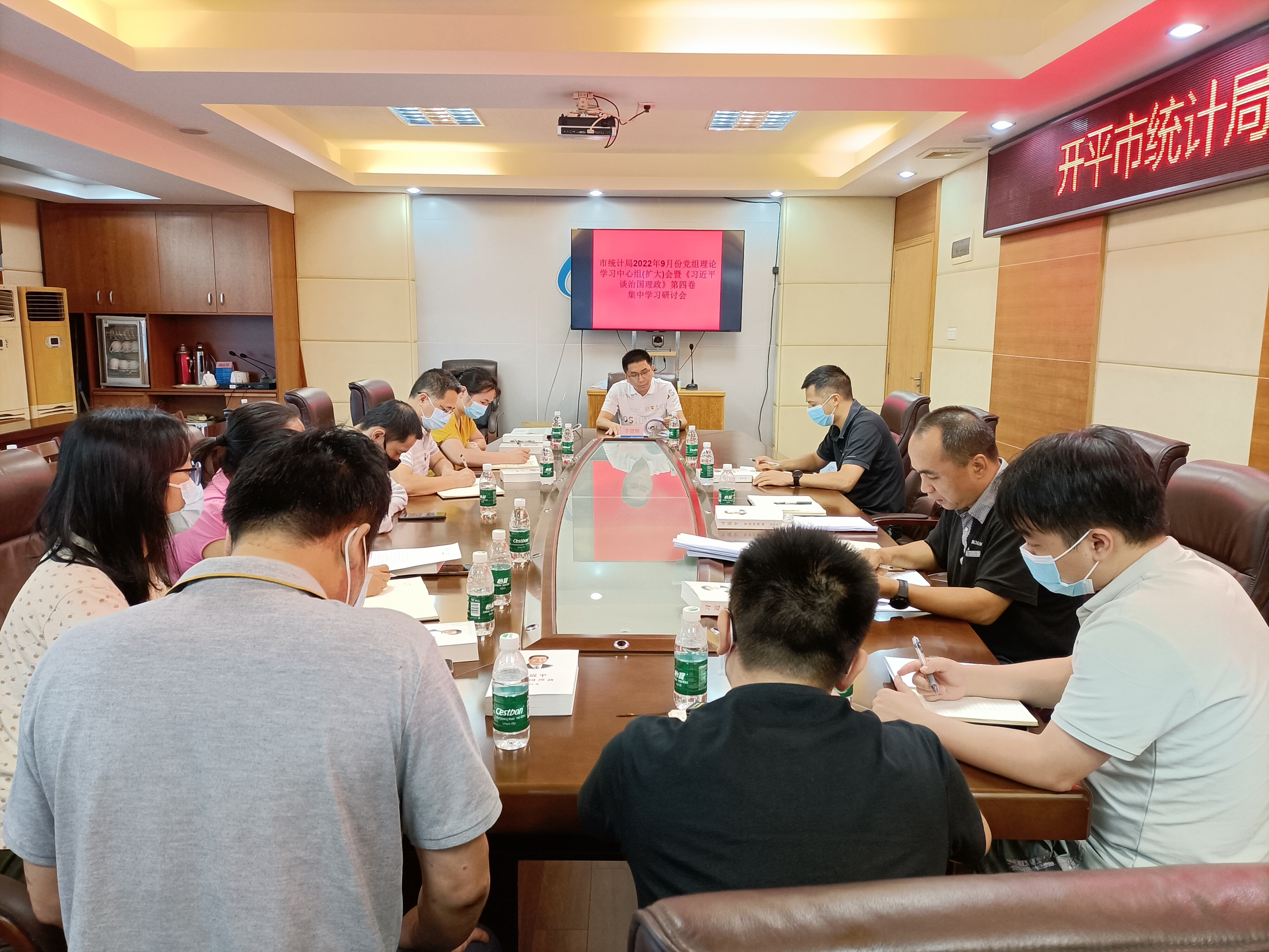 市統(tǒng)計局黨組理論學習中心組專題學習 《習近平談治國理政》第四卷 9月6日下午,市統(tǒng)計局黨組書記、局長李健鵬主持召開黨組理論學習中心組(擴大)學習會,專題學習《習近平談治國理政》第四卷。市統(tǒng)計局班子成員、股室負責人等參加學習會。 會上,李健鵬就《習近平談治國理政》第四卷的重點內容以及如何開展學習作了輔導講話,并領學了《堅持不懈把全面從嚴治黨向縱深推進》這篇文章。會議認為,《習近平談治國理政》第四卷收入了習近平總書記在2020年2月3日至2022年5月10日期間的講話、談話、演講、致辭、指示、賀信等109篇,共有21個專題,集中展現(xiàn)了馬克思主義中國化時代化的最新成果,是全面系統(tǒng)反映習近平新時代中國特色社會主義思想的權威著作。學習《習近平談治國理政》第四卷,對全局黨員干部來說,是筑牢理想信念、提高理論素養(yǎng)、增強政治能力的重要途徑。 對如何學好用好《習近平談治國理政》第四卷,李健鵬要求,一是全局上下要把學習《習近平談治國理政》第四卷作為一項重要政治任務,通過黨組、黨組理論學習中心組、“三會一課”等形式開展學習培訓,把《習近平談治國理政》第四卷與第一、二、三卷結合起來,與學習貫徹總書記對廣東系列講話重要指示精神結合起來,與貫徹落實省第十三次黨代會精神結合起來,教育引導廣大黨員、干部深刻領會“兩個確立”的決定性意義,增強“四個意識”、堅定“四個自信”、做到“兩個維護”,在新時代新征程上團結奮斗,勇毅前行。二是局領導班子要以身作則,帶頭先學一步、學深一層,形成一級帶一級,全局黨員一起學的良好局面。要堅持自覺主動學、深入思考學、聯(lián)系實際學、全面系統(tǒng)學、篤信篤行學,在學懂弄通做實上下功夫,不斷提高政治判斷力、政治領悟力、政治執(zhí)行力,切實把學習成果轉化為推動全市經濟和社會高質量發(fā)展的具體行動。黨員同志要及時做好學習總結,并認真撰寫心得,結合實際談認識、談體會、談貫徹落實舉措。三是要堅定落實“疫情要防住、經濟要穩(wěn)住、發(fā)展要安全”的要求,立足主責主業(yè),做好統(tǒng)計中心工作,高效統(tǒng)籌疫情防控和經濟社會發(fā)展,切實用習近平新時代中國特色社會主義思想武裝頭腦、指導實踐、推動工作,以實際行動迎接黨的二十大勝利召開。