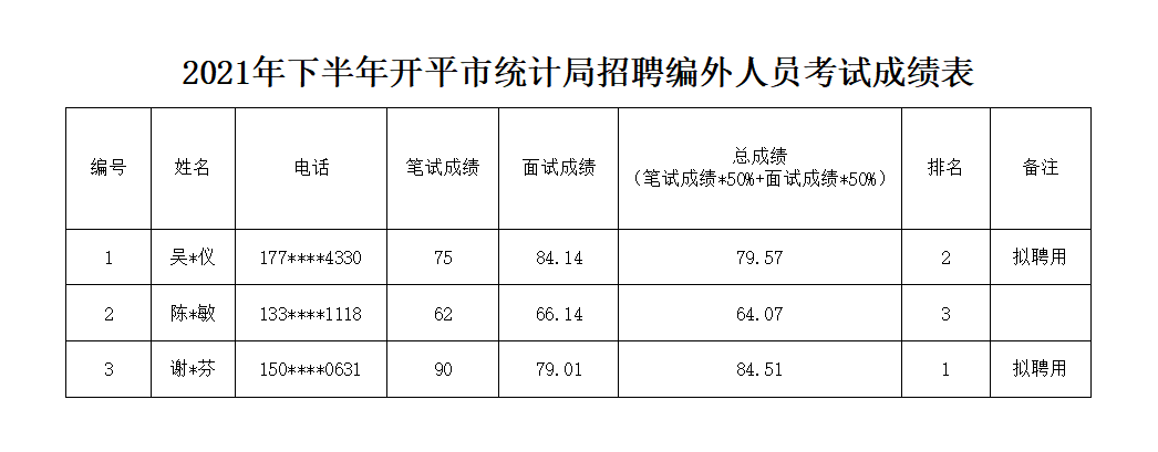 2021年下半年開平市統(tǒng)計(jì)局招聘編外人員考試成績公示 開平市統(tǒng)計(jì)局于2021年11月18日進(jìn)行了公開招聘編外人員考試,現(xiàn)將考試綜合成績公示如下: 1.公示時(shí)間為2021年11月19日至2021年11月25日。對(duì)公示如有異議,請(qǐng)于公示期內(nèi)反映情況。 聯(lián)系電話:0750-2268528甄小姐 2.根據(jù)考試成績情況,經(jīng)研究決定,統(tǒng)一劃定綜合成績合格分?jǐn)?shù)線為60分。總成績=面試成績*50%+筆試成績*50% 3.公示如無異議,體檢、考察的有關(guān)事項(xiàng)另行通知入圍應(yīng)聘人員,請(qǐng)相關(guān)應(yīng)聘人員務(wù)必保持聯(lián)系方式暢通。 開平市統(tǒng)計(jì)局 2021年11月19日