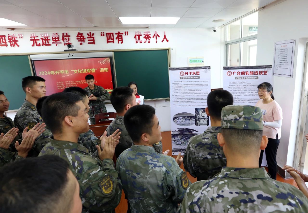 在部隊駐地,官兵們首先觀看了開平非遺圖文展覽,了解開平市的泮村燈會、開平民歌、開平灰塑、金聲獅鼓制作技藝、廣合腐乳釀造技藝等非物質文化遺產(chǎn)項目的歷史和內涵。