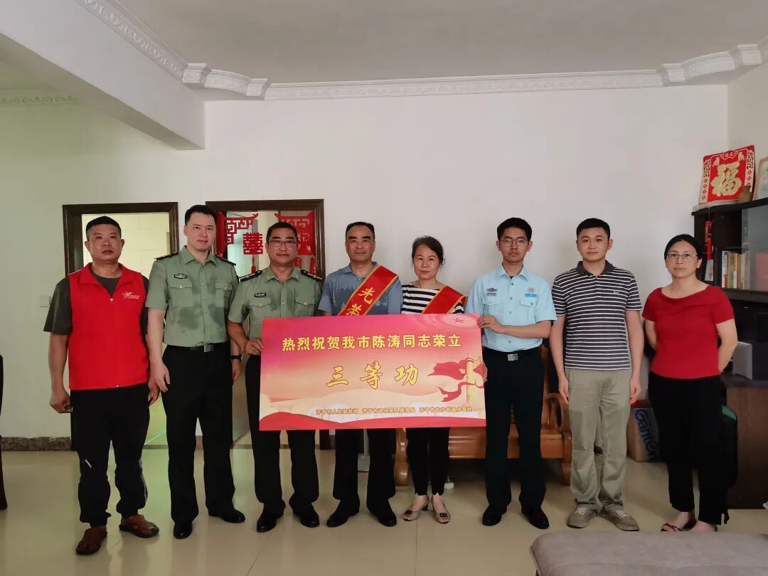 5月31日,開平市人民武裝部、市退役軍人事務(wù)局、長沙街道武裝部及退役軍人服務(wù)站一行組成報喜團,來到現(xiàn)役軍人陳濤家中,將三等功喜報和慰問金送到家屬手上。長沙街道黨工委委員、武裝部部長何永富為家屬戴上了“光榮軍屬”綬帶,并向他們表示熱烈祝賀和崇高敬意。接過喜報,陳濤家屬臉上洋溢著喜悅和自豪的笑容。報喜團和軍人家屬進行親切交談,詳細了解他們的身體狀況和生活情況,感謝他們?yōu)樽鎳嘤鰞?yōu)秀的青年,為黨和國家做出貢獻,以實際行動為家鄉(xiāng)增光添彩,并鼓勵他們一如既往支持孩子安心服役、建功軍營,爭取再創(chuàng)佳績,同時叮囑他們有任何困難要及時向有關(guān)部門反映。
