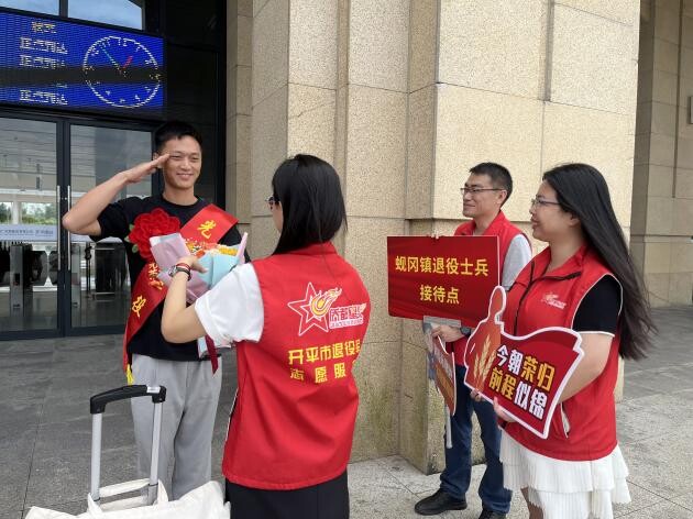 在報到現(xiàn)場,還閃爍著一抹抹鮮艷的“志愿紅”——僑都星火開平市退役軍人志愿服務(wù)隊。他們熱情地為返鄉(xiāng)退役士兵佩戴光榮綬帶、獻(xiàn)上鮮花、送上“返鄉(xiāng)報到大禮包”,同時還化身報到流程及相關(guān)政策法規(guī)的講解員,生動詮釋退役軍人志愿者“亮身份、做表率、當(dāng)先鋒、樹形象”的服務(wù)精神,將退役軍人“退役不褪色”的作風(fēng)本色與“奉獻(xiàn)、友愛、互助、進(jìn)步”的志愿服務(wù)精神結(jié)合起來,展現(xiàn)退役軍人志愿服務(wù)者“戎裝褪去忠誠在,急難險重顯擔(dān)當(dāng)”的精神風(fēng)貌。