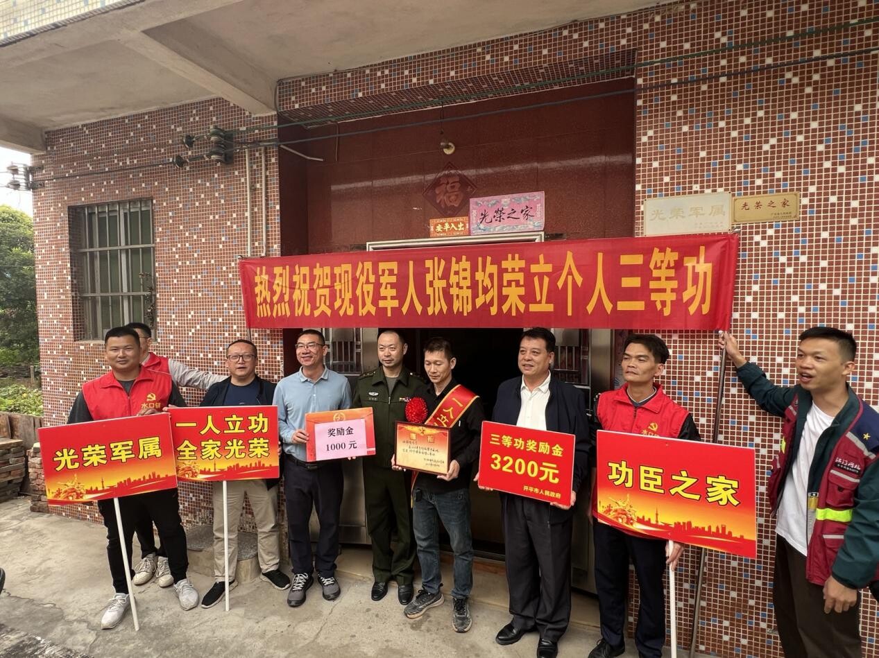 “恭喜恭喜,你們兒子好樣的,在部隊立了三等功,感謝你們?yōu)椴筷犈囵B(yǎng)出這么優(yōu)秀的人才。”在鑼鼓鞭炮聲和街坊鄰居祝賀聲中,報喜團(tuán)為現(xiàn)役軍人張錦均家屬送上立功喜報、獎勵金和慰問品,通過軍屬向立功的現(xiàn)役軍人表達(dá)誠摯的感謝,感謝他們舍小家為大家,為國防事業(yè)貢獻(xiàn)力量。希望家屬繼續(xù)支持和鼓勵士兵在保家衛(wèi)國的光榮崗位上再接再厲,再立新功。