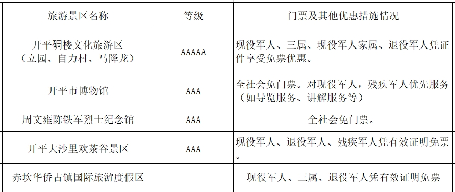 近年,開(kāi)平市大力建設(shè)“邑美僑鄉(xiāng)·世遺風(fēng)韻”鄉(xiāng)村振興示范帶,加快推進(jìn)“夢(mèng)回開(kāi)平·華海僑韻”夜經(jīng)濟(jì)項(xiàng)目建設(shè)運(yùn)營(yíng)落地,科農(nóng)文旅深度融合,優(yōu)待政策日益豐富。據(jù)統(tǒng)計(jì),全市共有5家A級(jí)以上景區(qū)面向全國(guó)退役軍人和其他優(yōu)撫對(duì)象提供優(yōu)待服務(wù),希望吸引全國(guó)戰(zhàn)友到開(kāi)平全域旅游。赤坎古鎮(zhèn)工作人員表示:“我們景區(qū)很榮幸能夠接待來(lái)自全國(guó)五湖四海的老兵,門(mén)票雖然免費(fèi),但服務(wù)絕對(duì)不打折扣?!?/span>