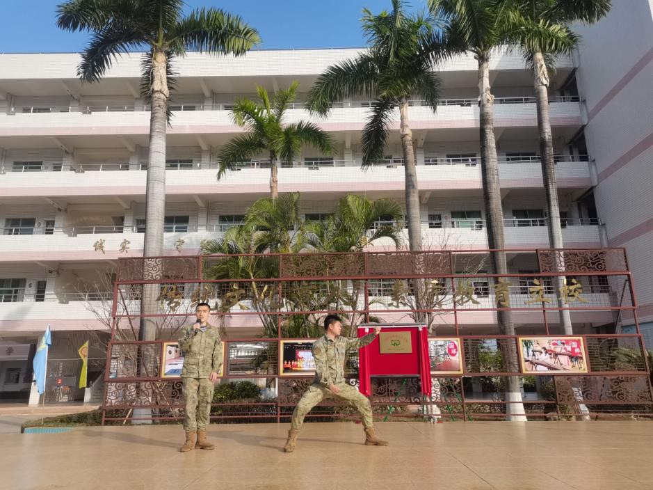 軍體拳演練樹強軍夢。軍人,作為祖國的鋼鐵長城,有著過硬的軍事素質(zhì)和堅韌不拔的精神。揭牌儀式后,來自駐開平部隊的軍兵們?yōu)橥瑢W們帶來了一場精彩絕倫的軍體拳展示。他們的一招一式剛勁有力、虎虎生威,每一個動作都盡顯軍人的力量與自信,充分展現(xiàn)了軍人的颯爽英姿和威武風采,贏得了同學們的陣陣掌聲和喝彩聲。隨后,軍官們親自教學軍體拳的經(jīng)典動作。他們耐心地講解動作要領(lǐng),手把手地指導同學們糾正姿勢。同學們學習熱情高漲,認真模仿著每一個動作,努力將動作做到標準、規(guī)范。通過這次學習,大家對國防和軍隊現(xiàn)代化建設有了更深入的了解,也切實感受到了保家衛(wèi)國、強軍國安的重要意義。
