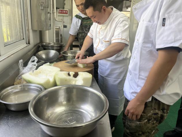 上午9時(shí),烹飪交流活動(dòng)在軍營食堂正式啟動(dòng)?;顒?dòng)聚焦“特色菜”、“家常菜”兩大教學(xué)菜單,以分段授課交流的方式,由廣東省“粵菜師傅”二星級(jí)廚師甄樹源及中式烹調(diào)高級(jí)廚師譚仲康等兩位粵菜名廚掌勺,現(xiàn)場進(jìn)行親身示范教學(xué)。?制作臺(tái)前,名廚展示了地方特色菜——潭碧冬瓜盅的雕刻技法和高湯吊制技巧,并帶領(lǐng)大家一起調(diào)配僑鄉(xiāng)特色燜馬岡鵝和藥膳水晶乳鴿的醬料,與在場官兵高頻互動(dòng),參與士兵紛紛記錄烹飪要訣。有士兵感慨:“一些烹飪的小細(xì)節(jié)真是太妙了,這技巧轉(zhuǎn)業(yè)后開餐館都用得上!”吳淑芬主任也指出:“本次活動(dòng)以飲食文化為紐帶,既提升官兵生活技能,又讓傳統(tǒng)粵菜技藝在軍營扎根?!?/span>