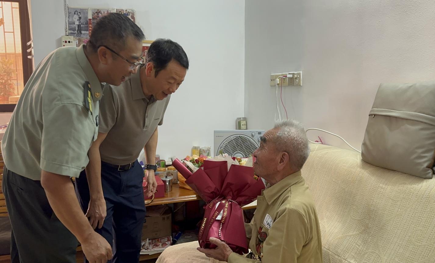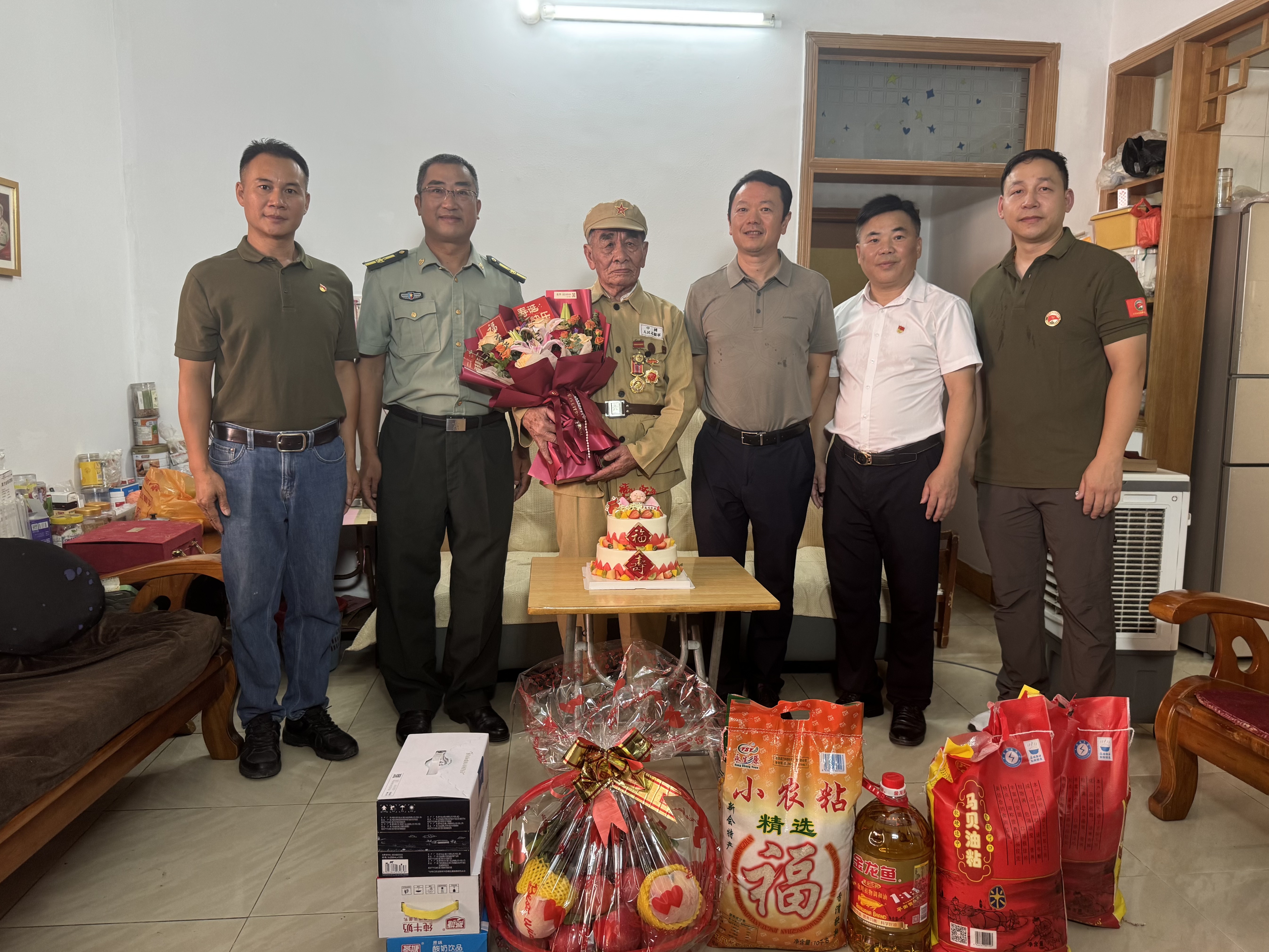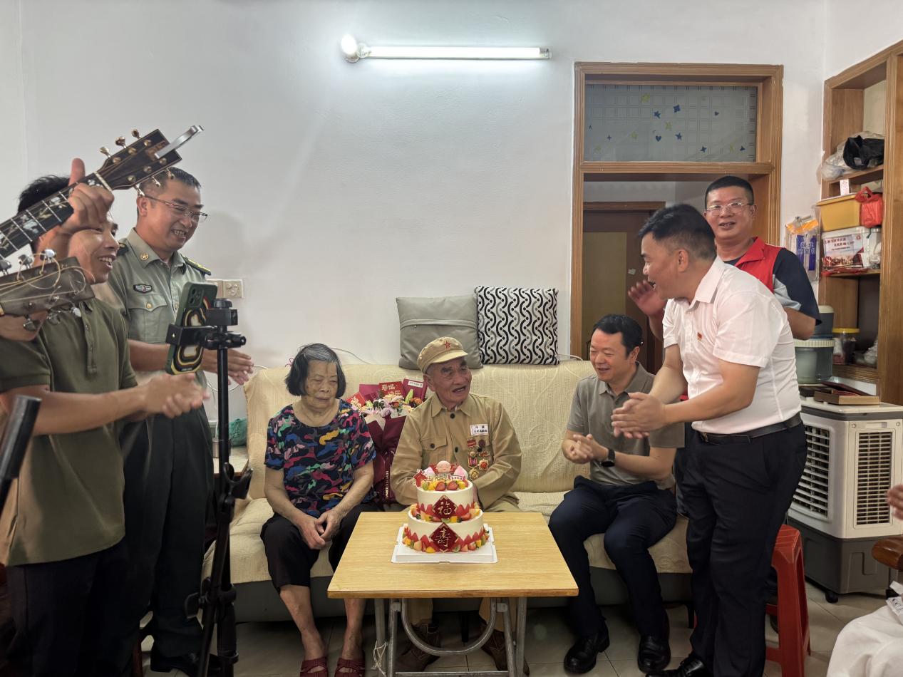 7月9日下午,開平市長沙街道的居民樓里暖意融融。曾參加解放戰(zhàn)爭、抗美援朝戰(zhàn)爭的老兵譚靄云坐在客廳的沙發(fā)上,胸前掛著的勛章在午后陽光下閃閃發(fā)亮。這天,開平市退役軍人事務(wù)局局長張澤康、長沙人武部部長何永富,開平市愛國擁軍促進會黨支部書記譚振勝等十余人帶著鮮花、蛋糕和敬意,提前為老人慶祝7月11日的百歲生日。