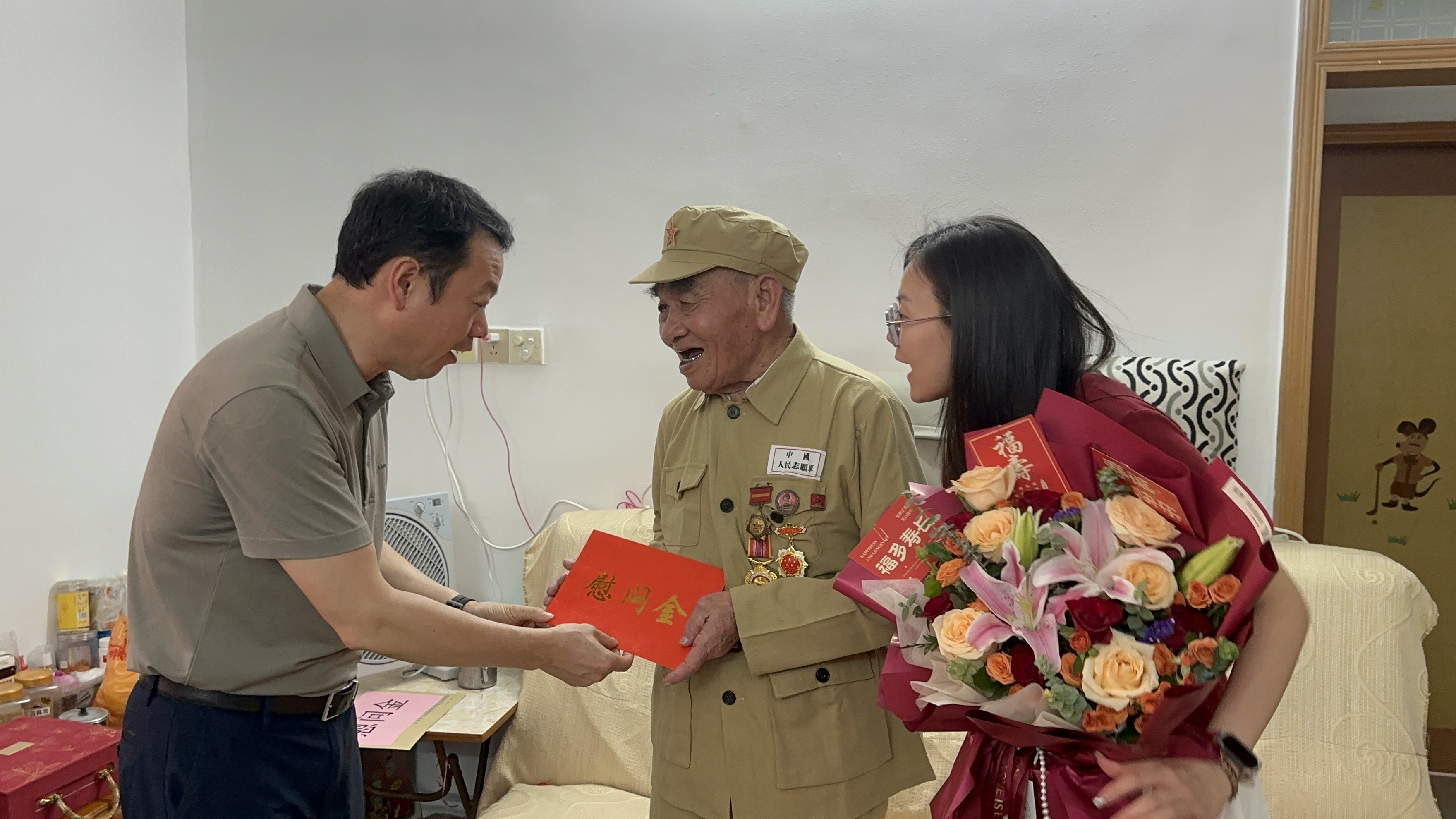 慶生現(xiàn)場被裝點得格外溫馨:粉白相間的康乃馨擺在茶幾中央,三層蛋糕上“百歲壽星 英雄永存”的字樣格外醒目,墻角的音響里正循環(huán)播放著《中國人民志愿軍戰(zhàn)歌》?!白T伯當年不僅打仗勇敢,之前在愛民村當二十多年的村小組組長時,修水渠、管生產(chǎn),樁樁件件都為村民著想。”陪同前來的愛民村委會代表湊近老人耳邊說。老人聞言擺擺手,笑出了聲:“都是該做的,當兵保家,回鄉(xiāng)護民,一樣的。”