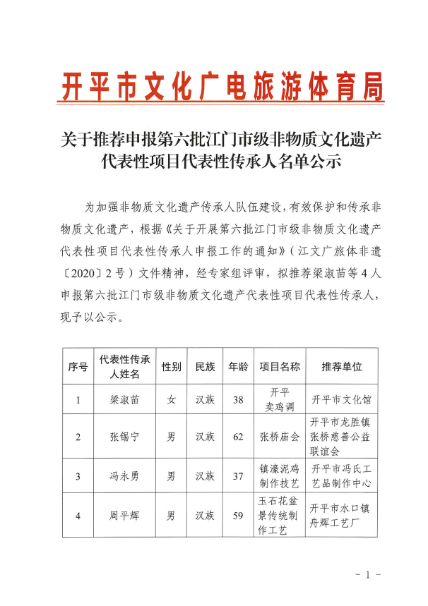 關(guān)于推薦申報(bào)第六批江門市級(jí)非物質(zhì)文化遺產(chǎn)代表性項(xiàng)目代表性傳承人名單公示
