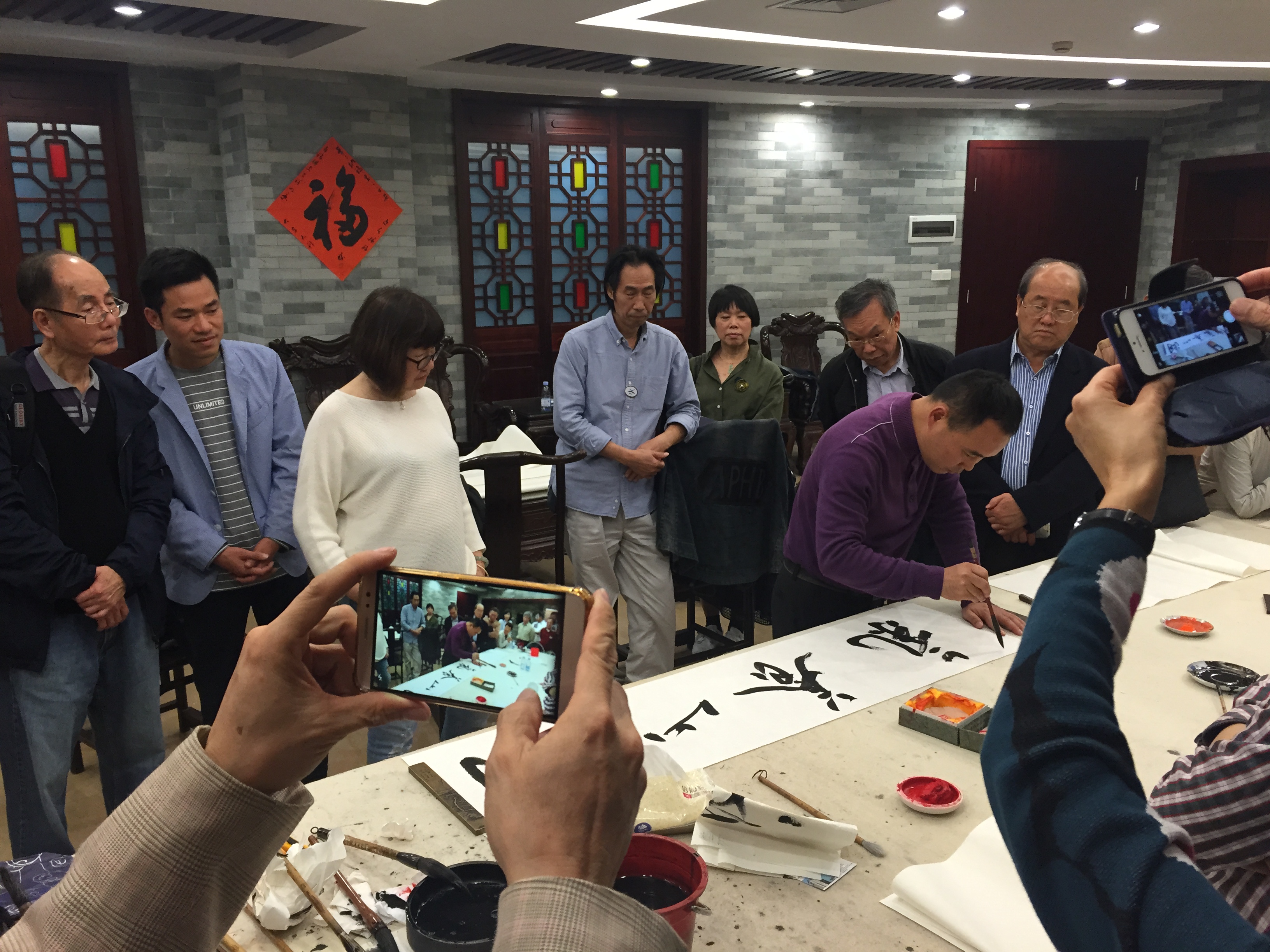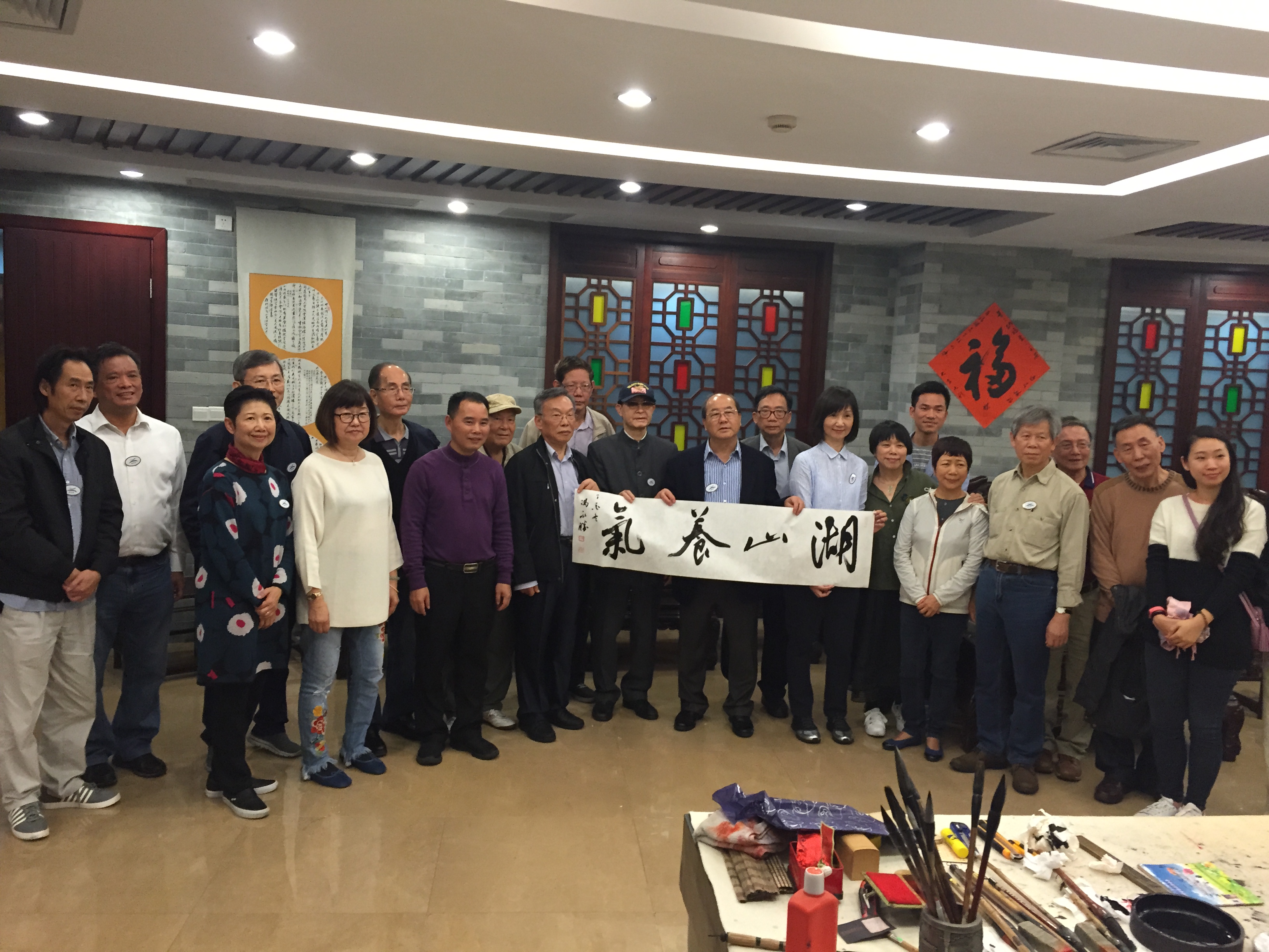 11月28日,香港中聯(lián)辦宣傳文體部組織中國書法家協(xié)會香港分會會員一行25人組成“大灣區(qū)文化行”參訪團(tuán)到開平市參訪交流。參訪團(tuán)一行首先參觀了開平市文化館和開平市非物質(zhì)文化遺產(chǎn)展示館,然后到世界文化遺產(chǎn)——自力村碉樓群和立園景區(qū)實(shí)地參觀和采風(fēng)。開平市文廣新局副局長譚發(fā)寧陪同參訪。 晚上,參訪團(tuán)書法家與開平書法家在譚逢敬藝術(shù)院舉行交流、筆會、雅集活動。兩地藝術(shù)家交流書法創(chuàng)作心得體會,氣氛熱烈融洽,活動收到良好的效果。江門市書法家協(xié)會主席、開平市文聯(lián)主席馮永勝,開平市美術(shù)館館長李強(qiáng)穩(wěn)等參加了雅集交流活動。 中國書法家協(xié)會香港分會交流合照 香港書法家交流 馮永勝現(xiàn)場揮毫交流