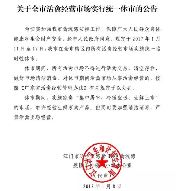 【江門7天沒活雞活鵝賣 已有2人染H7N9死亡】 江門市人民政府今天發(fā)布公告:現(xiàn)定于2017年1月11日至17日,我市在全市轄區(qū)內(nèi)所有活禽經(jīng)營市場,實施統(tǒng)一臨時性休市。休市期間,所有活禽市場不得進行活禽交易,清空存欄,做好市場清潔消毒。對休市期間活禽市場從事活禽經(jīng)營的,按照《廣東省活禽經(jīng)營管理辦法》有關(guān)規(guī)定予以處罰。休市期間,實施家禽“集中屠宰、冷鏈配送、生鮮上市”的市場,準(zhǔn)許經(jīng)營生鮮家禽產(chǎn)品。但同時要加強清潔消毒,嚴(yán)禁活禽出場經(jīng)營。