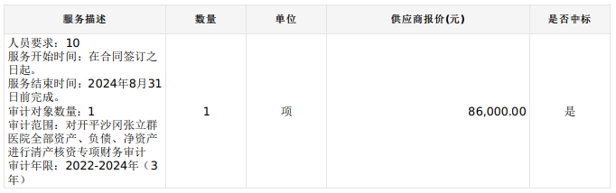 【跳轉進入中國政府采購網廣東分網廣東省政府采購網】廣東 政府采購智慧云平臺電子賣場 定點議價成交公告 項目名稱:開平市衛(wèi)生健康局審計服務定點采購 項目編號:DDYJ-2024-1151949 本項目于2024-05-08 12:02:41啟動?,F將本次議價結果公布如下: 本項目采用的是按項目的報價方式。 (一)成交供應商:鵬盛會計師事務所(特殊普通合伙) (二)成交價:86000.00(捌萬陸仟元整) (三)成交標的明細 采購單位:開平市衛(wèi)生健康局 2024年05月08日