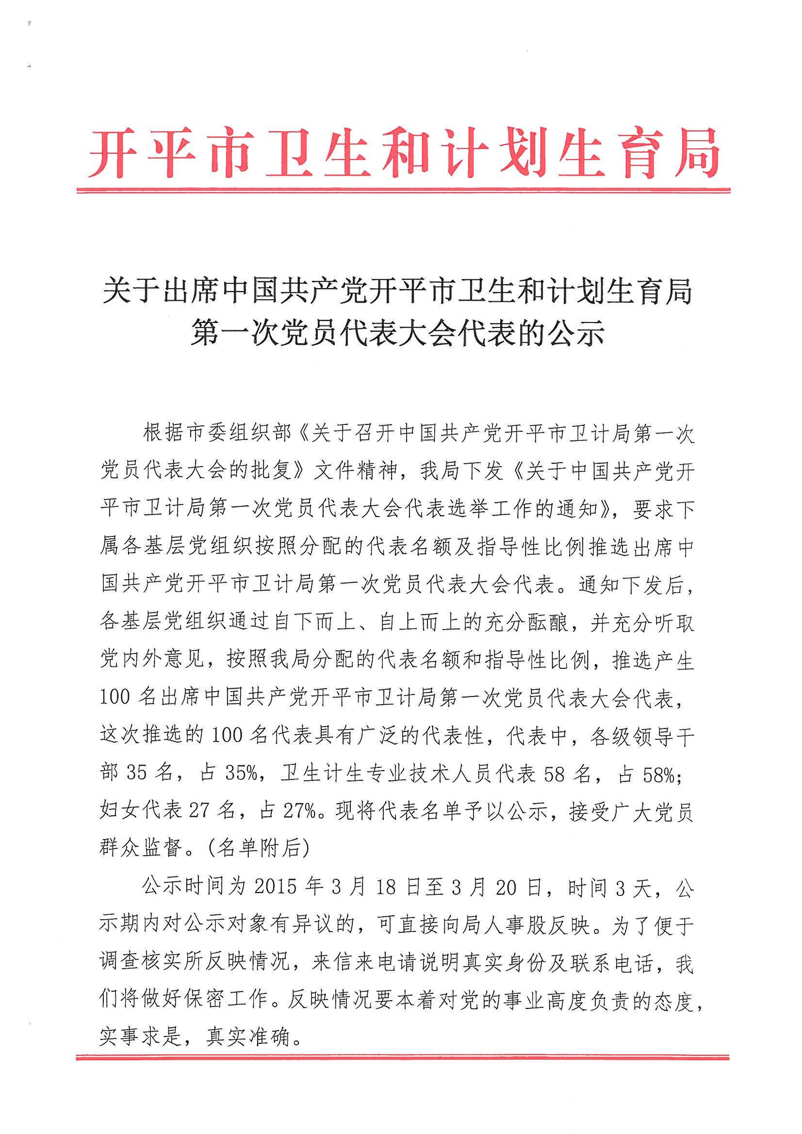 關(guān)于出席中國共產(chǎn)黨開平市衛(wèi)生和計劃生育局第一次黨員代表大會代表的公示