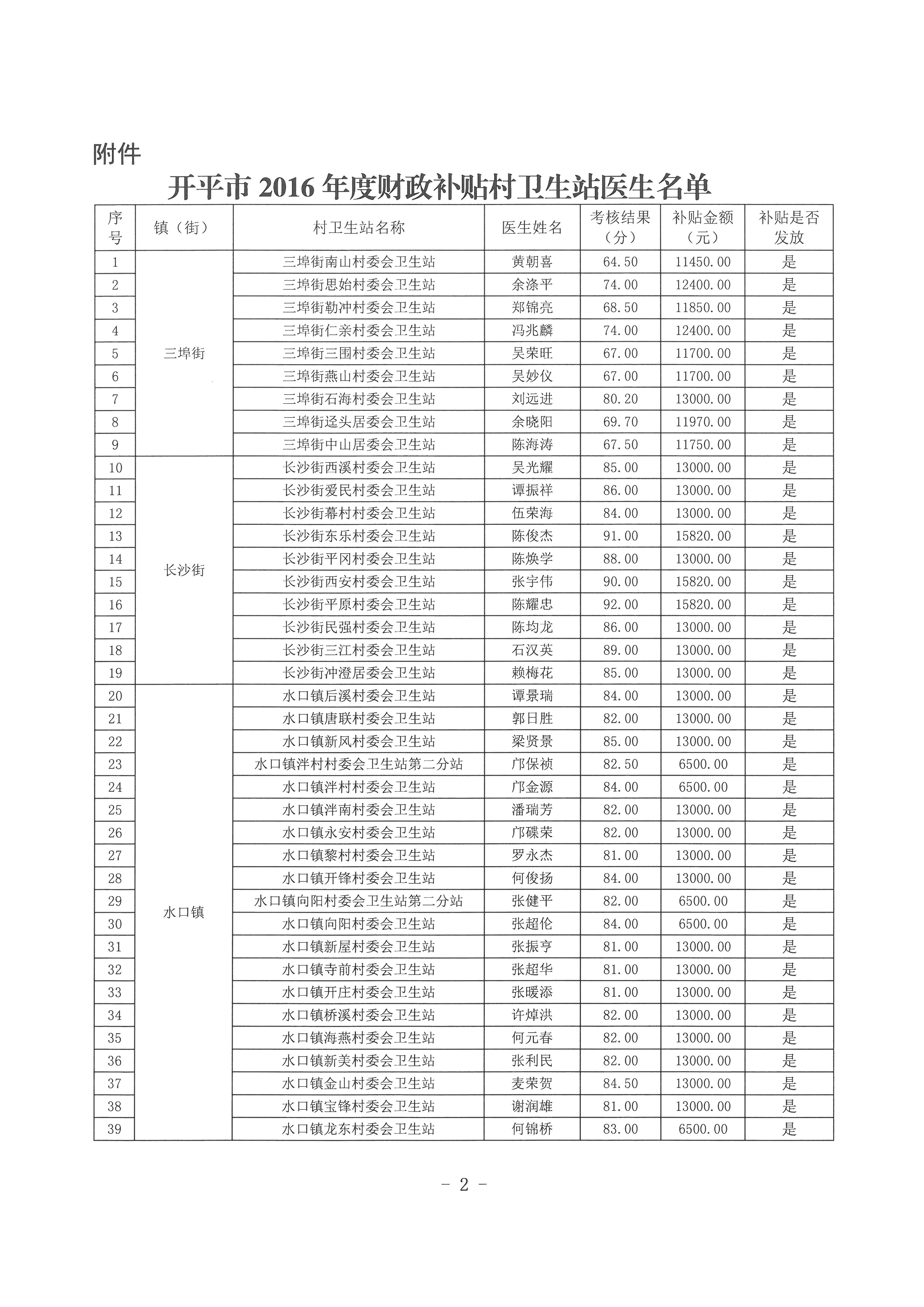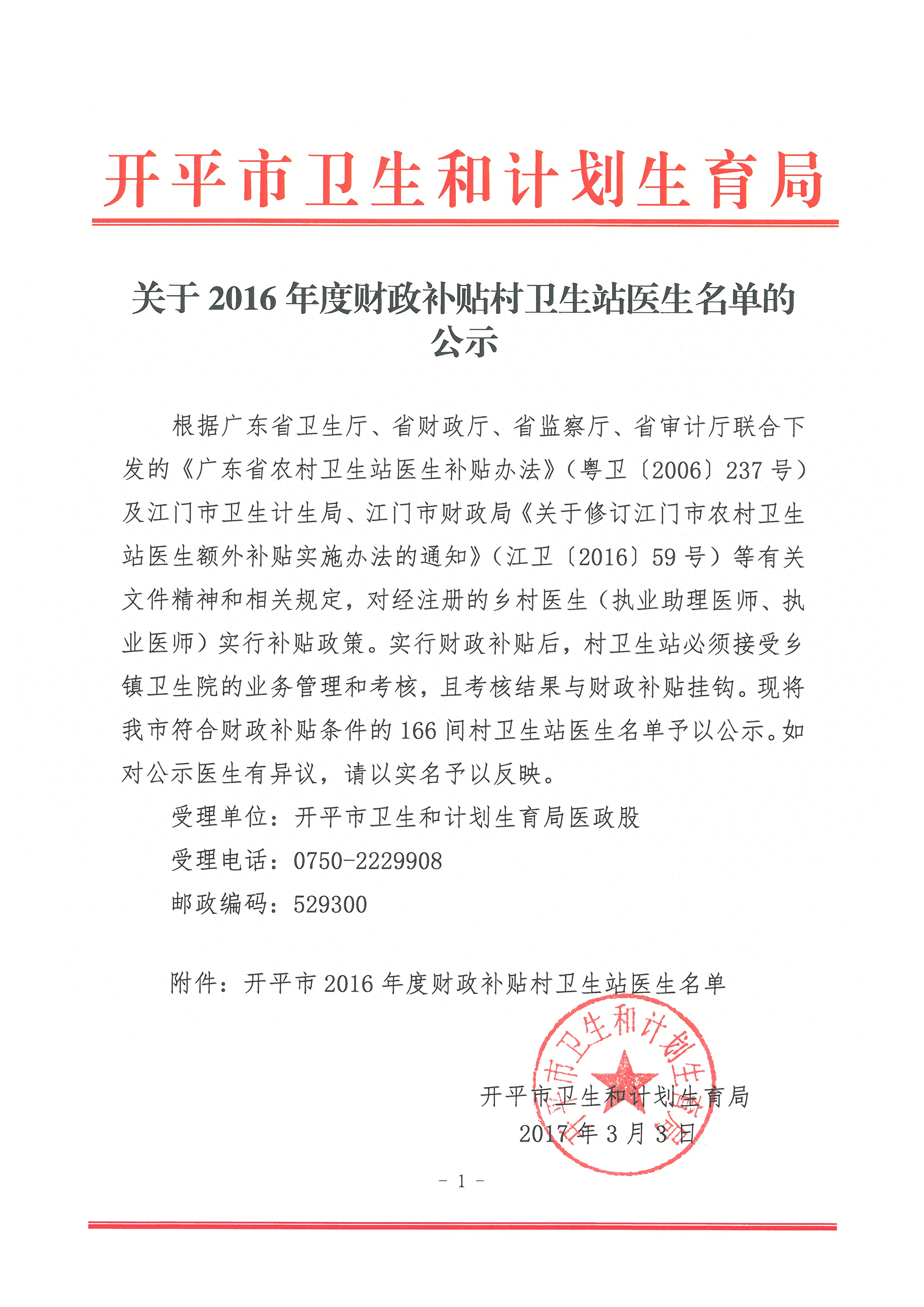 【開平市政府信息公開】關于2016年度財政補貼村衛(wèi)生站醫(yī)生名單的公示http://zwgk.kaiping.gov.cn/Government/PublicInfoShow.aspx?ID=18550