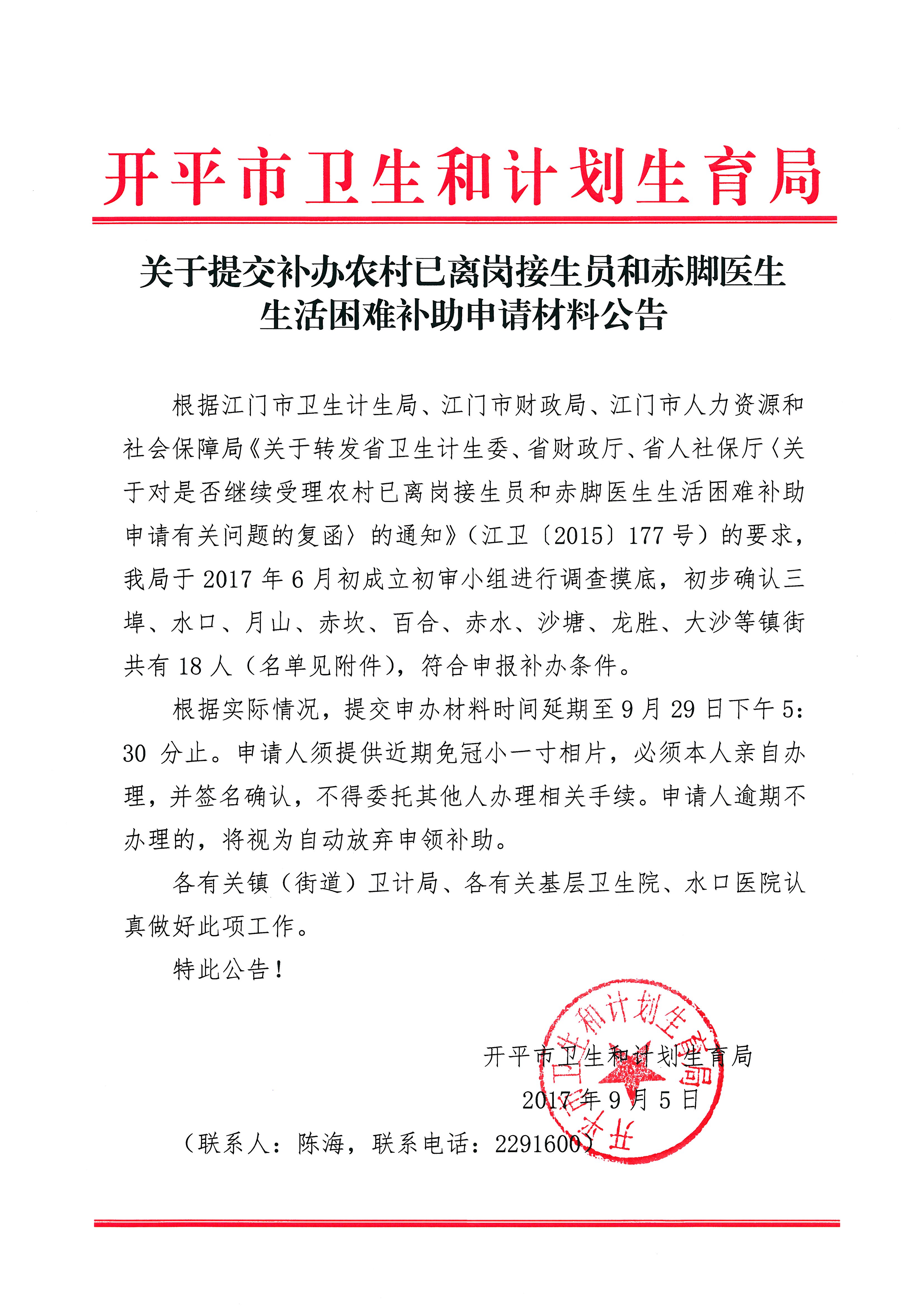 【2017-9-5】關(guān)于提交補(bǔ)辦農(nóng)村已離崗接生員和赤腳醫(yī)生生活困難補(bǔ)助申請(qǐng)材料公告