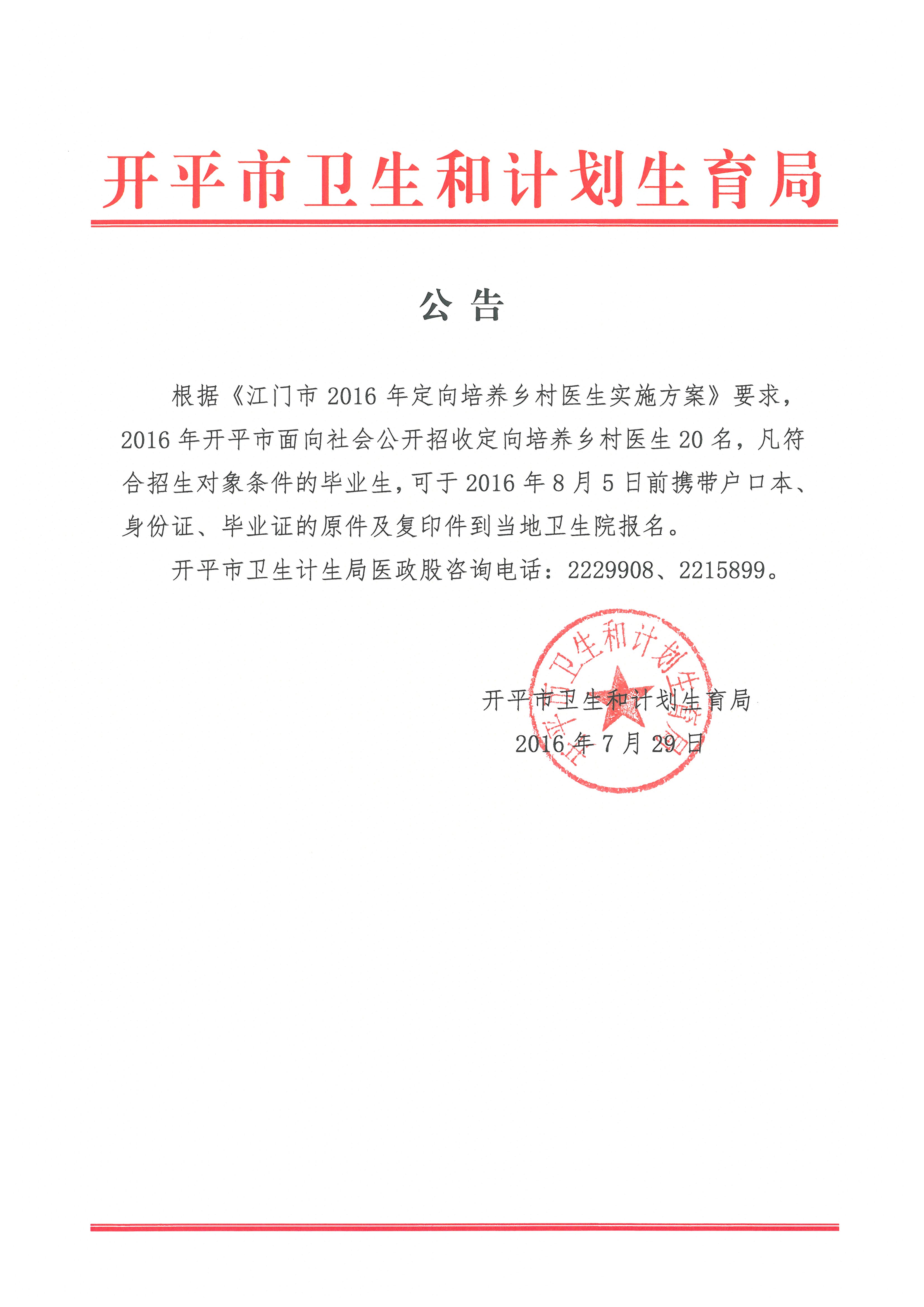 ?? 轉發(fā)關于印發(fā)《江門市2016年定向培養(yǎng)鄉(xiāng)村醫(yī)生實施方案》的通知(開衛(wèi)字〔2016〕269號) http://wjj.kaiping.gov.cn/akcms_item.php?id=1859 ??
