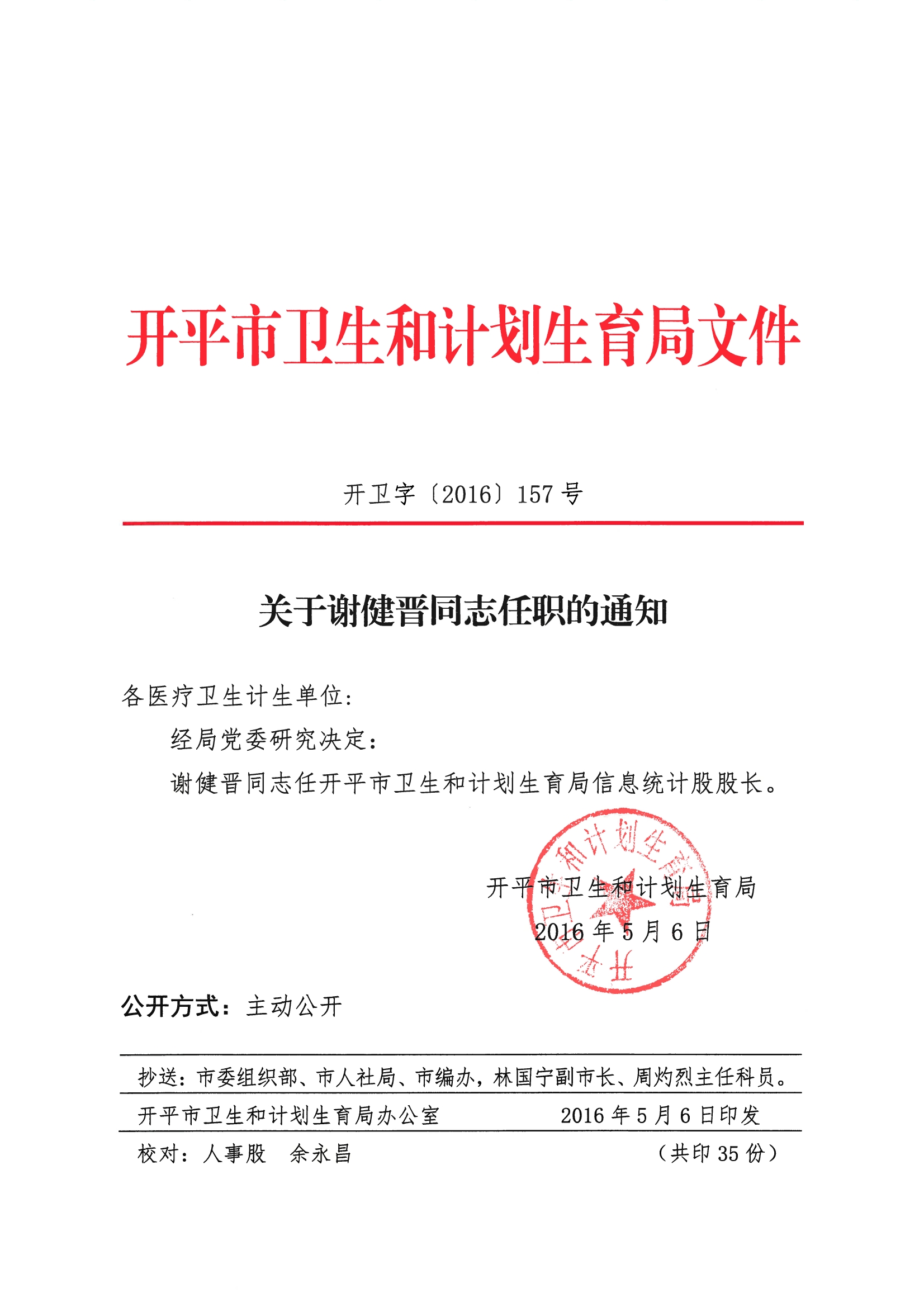 關于謝健晉同志任職的通知(開衛(wèi)字〔2016〕157號)