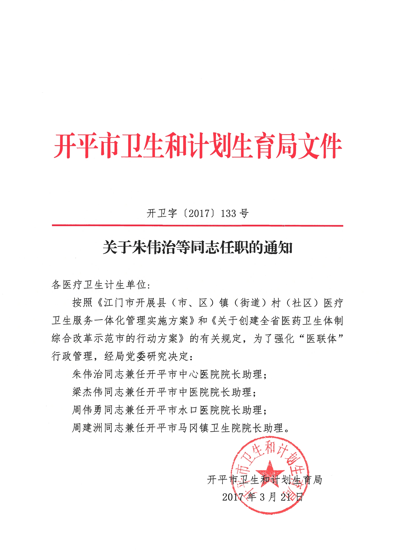 關(guān)于朱偉治等同志任職的通知(開衛(wèi)字〔2017〕133號)