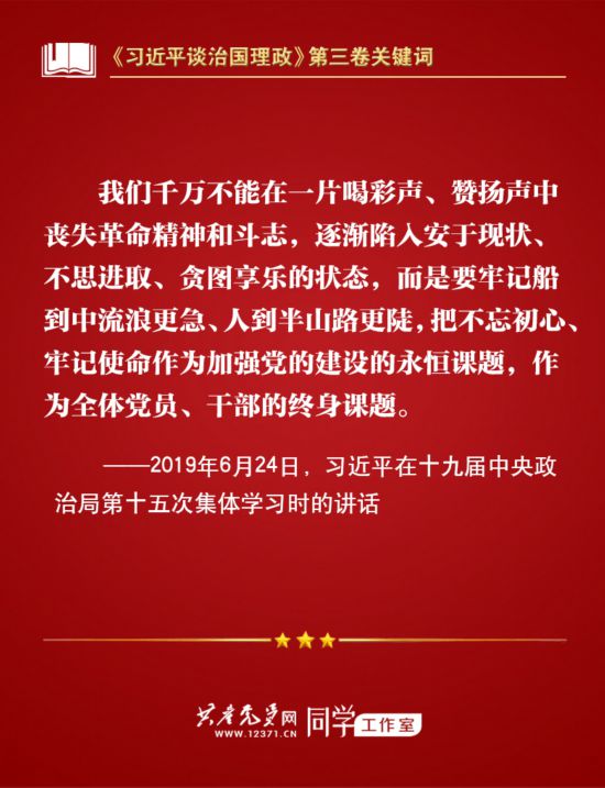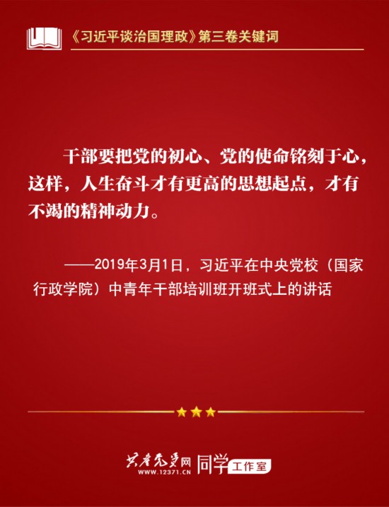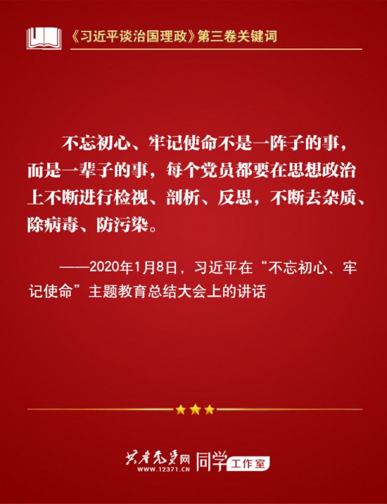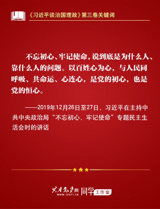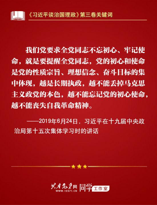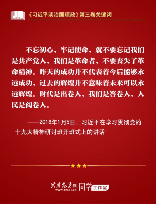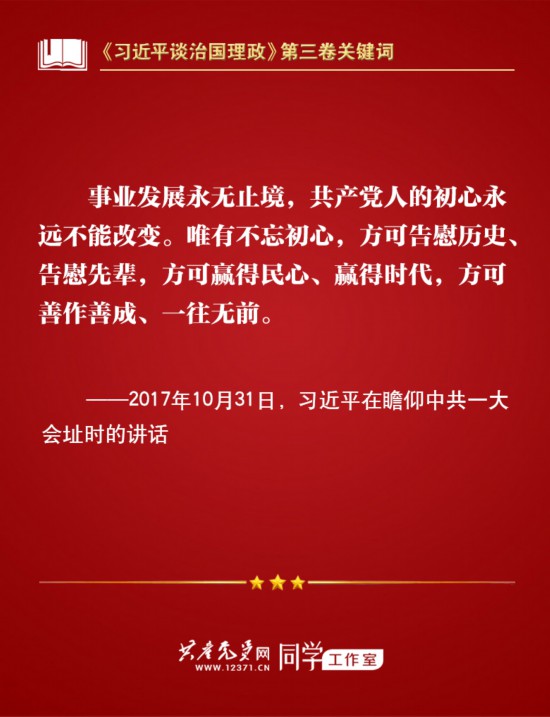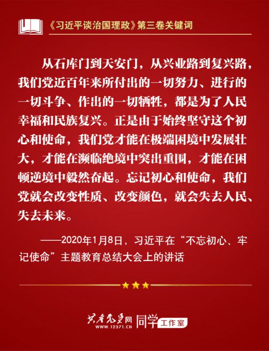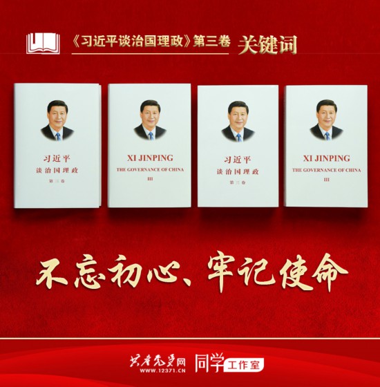 來源:共產(chǎn)黨員網(wǎng) 中央宣傳部(國務(wù)院新聞辦公室)會同中央黨史和文獻研究院、中國外文局編輯的《習(xí)近平談治國理政》第三卷,由外文出版社以中英文版出版,面向海內(nèi)外發(fā)行。 《習(xí)近平談治國理政》第三卷收入了習(xí)近平總書記在2017年10月18日至2020年1月13日期間的報告、講話、談話、演講、批示、指示、賀信等92篇,分為19個專題。 這部重要著作生動記錄了黨的十九大以來以習(xí)近平同志為核心的黨中央,著眼中華民族偉大復(fù)興的戰(zhàn)略全局和世界百年未有之大變局,團結(jié)帶領(lǐng)全黨全國各族人民推動黨和國家各項事業(yè)取得新的重大進展的偉大實踐,集中展示了馬克思主義中國化的最新成果,充分體現(xiàn)了我們黨為推動構(gòu)建人類命運共同體貢獻的智慧方案,是全面系統(tǒng)反映習(xí)近平新時代中國特色社會主義思想的權(quán)威著作。 我們梳理習(xí)近平總書記部分講話,帶你學(xué)習(xí)著作中的關(guān)鍵詞。今天的關(guān)鍵詞是“不忘初心、牢記使命”。