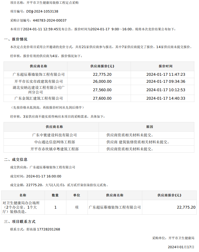 開平市衛(wèi)生健康局裝修工程定點(diǎn)采購(gòu)定點(diǎn)競(jìng)價(jià)成交公告