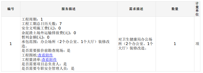 定點(diǎn)議價采購公告 開平市衛(wèi)生健康局采用定點(diǎn)采購議價方式實(shí)施本次采購。 一、項(xiàng)目信息 (一)項(xiàng)目名稱:開平市衛(wèi)生健康局裝修工程定點(diǎn)采購 (二)項(xiàng)目編號:DDYJ-2024-1060289 (三)預(yù)算金額:28,000.00 (四)采購需求: (五)議價發(fā)起時間:2024年01月19日 二、需求信息 合同份數(shù):3 爭議處理方式:向仲裁委員會申請仲裁解決 發(fā)票類型:增值稅普通發(fā)票 三、供應(yīng)商報價須知 (一)被邀請的供應(yīng)商應(yīng)根據(jù)議價信息的要求,在滿足采購需求的前提下,于規(guī)定時間內(nèi)對項(xiàng)目做出報價。 (二)供應(yīng)商應(yīng)在報價時,可通過系統(tǒng)提供采購需求中所要求的全部資料與數(shù)據(jù)的,應(yīng)當(dāng)通過系統(tǒng)提交。供應(yīng)商不得在所上傳的