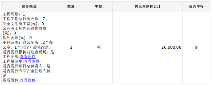 定點議價成交公告 項目名稱:開平市衛(wèi)生健康局裝修工程定點采購 項目編號:DDYJ-2024-1060289 本項目于2024-01-19 09:47:03啟動?,F(xiàn)將本次議價結(jié)果公布如下: (一)成交供應(yīng)商:開平市長實市政建筑有限公司 (二)成交價:26000.00(貳萬陸仟元整) (三)成交標(biāo)的明細 采購單位:開平市衛(wèi)生健康局 2024年01月19日