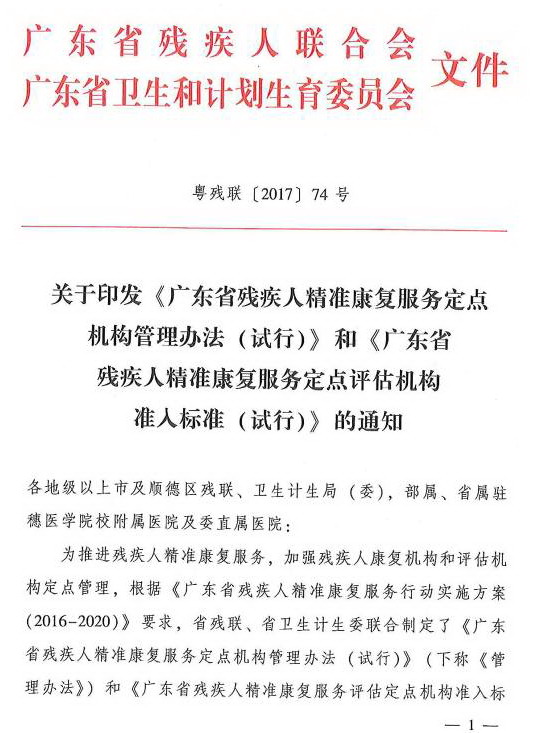 《廣東省殘疾人精準康復服務定點機構管理辦法(試行)》和《廣東省殘疾人精準康復服務定點評估機構準入標準(試行)》