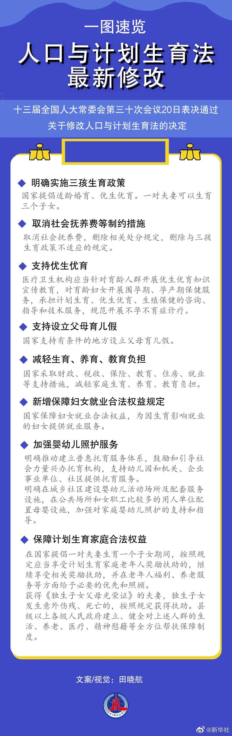 全國人大常委會會議20日表決通過了關(guān)于修改人口與計(jì)劃生育法的決定。修改后的人口計(jì)生法規(guī)定,國家提倡適齡婚育、優(yōu)生優(yōu)育,一對夫妻可以生育三個子女。國家采取財(cái)政、稅收、保險、教育、住房、就業(yè)等支持措施,減輕家庭生育、養(yǎng)育、教育負(fù)擔(dān)。 (來源:新華網(wǎng)?2021年8月20日) 來源:全國人民代表大會常務(wù)委員會關(guān)于修改《中華人民共和國人口與計(jì)劃生育法》的決定 (聯(lián)系部門:開平市衛(wèi)生健康局辦公室,電話:2252003)