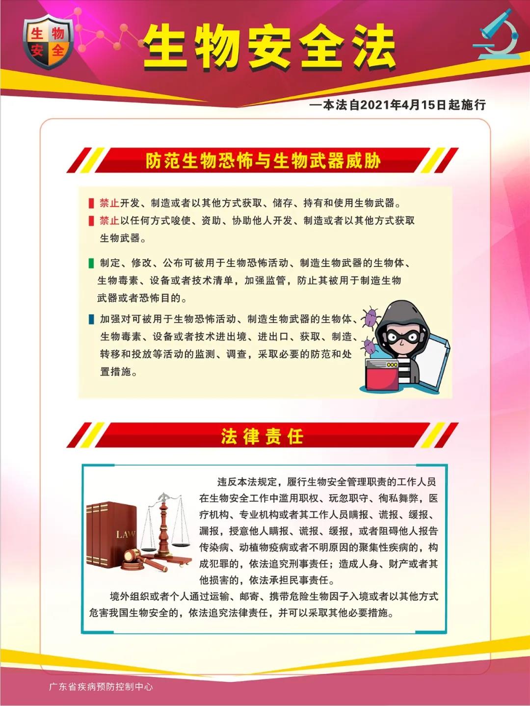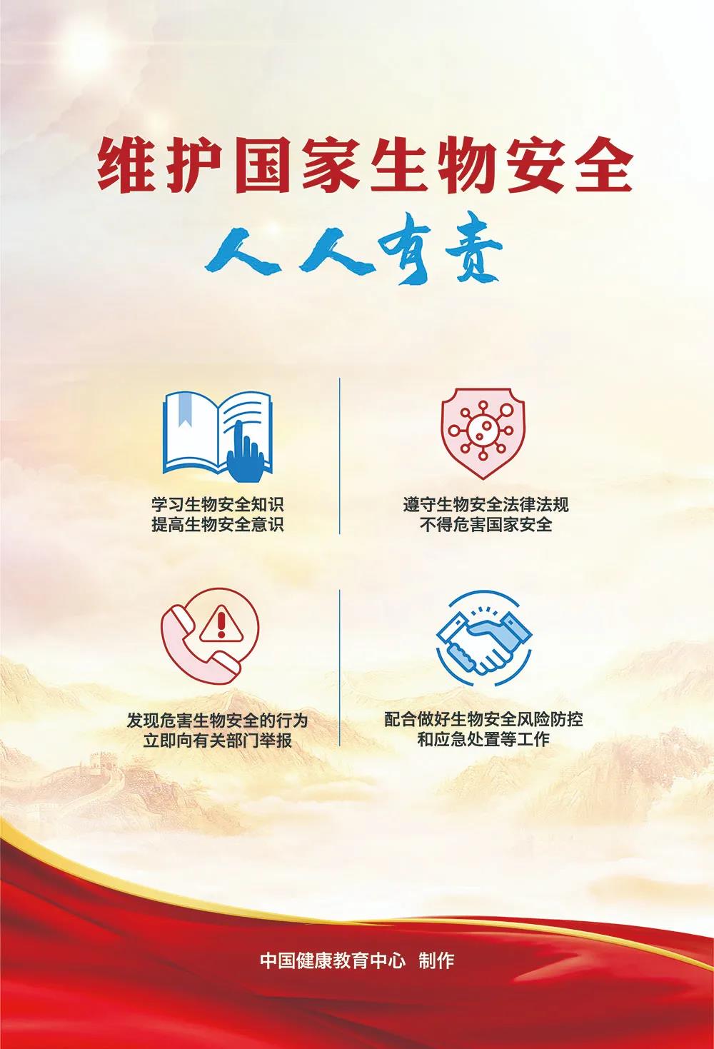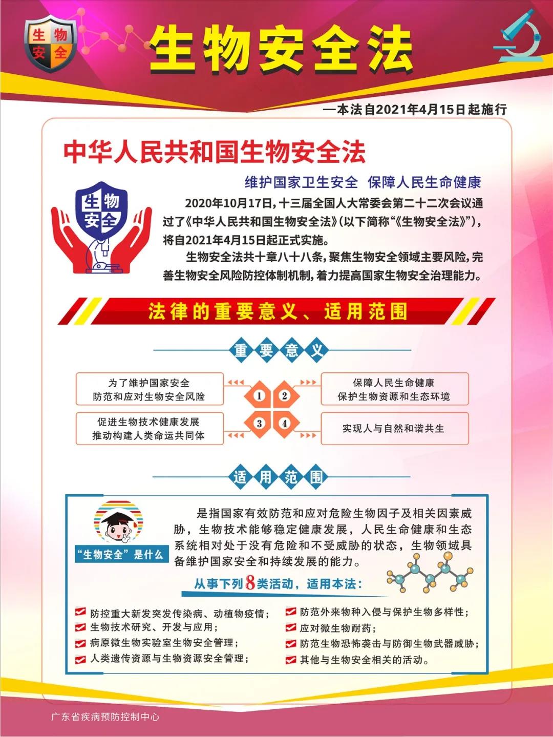 信息來(lái)源:中國(guó)健康教育中心、廣東疾控 4月15日是第六個(gè)全民國(guó)家安全教育日,也是《中華人民共和國(guó)生物安全法》(以下簡(jiǎn)稱《生物安全法》)實(shí)施日。 2020年2月14日,習(xí)近平總書(shū)記在中央全面深化改革委員會(huì)第十二次會(huì)議中發(fā)表重要講話:“把生物安全納入國(guó)家安全體系”、“要盡快推動(dòng)出臺(tái)生物安全法”,為《生物安全法》的出臺(tái)指明了方向。 下面6張海報(bào) 一起來(lái)學(xué)習(xí)《生物安全法》吧 ↓↓↓