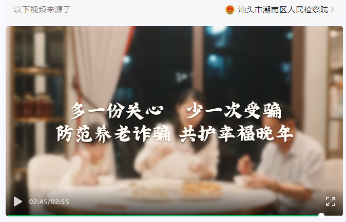 來源:廣東政法【閱讀原文】 綜合自:汕頭檢察、順德區(qū)人民法院、江門政法、潮州政法 為加大打擊整治養(yǎng)老詐騙專項行動宣傳力度,持續(xù)營造強大輿論聲勢,連日來,廣東各地各成員單位創(chuàng)新宣傳內(nèi)容和形式,推出了一批主題鮮明、創(chuàng)作新穎、直觀生動的新媒體作品,圍繞養(yǎng)老詐騙的危害性、迷惑性、欺騙性開展宣傳,幫助老年人群體提高法治意識和識騙防騙能力,切實維護(hù)好老年人的合法權(quán)益。 近年來,以銷售“保健產(chǎn)品”“養(yǎng)老理財”等為名的養(yǎng)老詐騙手法層出不窮,掏空了老人用來安享晚年的“錢袋子”。為加強宣傳力度,汕頭市潮南區(qū)人民檢察院制作防范養(yǎng)老詐騙微視頻,揭露詐騙套路手法,幫助老年人提高法治意識和防范詐騙的能力。 老人沒買社保,擔(dān)心會增加孩子壓力,憂心忡忡之下,“干兒子”提出認(rèn)識社保局的工作人員,可以一次性代繳養(yǎng)老保險……快看看佛山市順德區(qū)人民法院根據(jù)真實案例改編制作的微視頻,提醒老人轉(zhuǎn)賬要當(dāng)心,熟人詐騙更要防。 理性選擇養(yǎng)老服務(wù),警惕非法集資陷阱。近日,江門市公安局新會分局推出原創(chuàng)“沙畫”——《守好錢袋子 護(hù)好幸福家》,轉(zhuǎn)給身邊的老年人,教他們識破養(yǎng)老詐騙騙局,遠(yuǎn)離詐騙! 不法分子假借免費體驗、養(yǎng)生講座、專家義診、消費返利等方式,夸大保健品治療功效,欺騙誘導(dǎo)老年人高價購買保健品和保健服務(wù),甚至銷售偽劣產(chǎn)品,對老年人身心健康造成嚴(yán)重傷害。潮州市潮安區(qū)委政法委、潮州市公安局潮安分局聯(lián)合制作的反詐木偶小品《真真假假》,提醒老人不要相信詐騙分子所說的“神丹妙藥”,任何宣稱包治百病、藥到病除的“神藥”都是欺詐行為。 中央政法委在12337智能化舉報平臺開通“養(yǎng)老詐騙”舉報通道 2.廣東省委政法委接收書面舉報,郵寄地址:廣州市越秀區(qū)新河浦合群三馬路29號省打擊整治養(yǎng)老詐騙專項行動辦公室,郵政編碼:510082。 【舉報渠道】 1、江門市接收舉報渠道 郵寄地址:江門市蓬江區(qū)白沙街道農(nóng)林西路70號江門市打擊整治養(yǎng)老詐騙專項行動辦公室,郵政編碼:529000 舉報電話:110 2、各縣(市、區(qū))接收舉報渠道 (1)蓬江區(qū) 郵寄地址:江門市蓬江區(qū)天河?xùn)|路20號—8號樓蓬江區(qū)打擊整治養(yǎng)老詐騙專項行動辦公室,郵政編碼:529000 舉報電話:0750-3213396(法定工作日上午8:30-12:00,下午2:30-5:30) (2)江海區(qū) 郵寄地址:江門市江海區(qū)東海路338號政法大樓江海區(qū)打擊整治養(yǎng)老詐騙專項行動辦公室,郵政編碼:529000 舉報電話:0750-3862133(法定工作日上午8:30-12:00,下午2:30-5:30) (3)新會區(qū) 郵寄地址:江門市新會區(qū)同慶路1號新會區(qū)打擊整治養(yǎng)老詐騙專項行動辦公室,郵政編碼:529100 舉報電話:0750-6654813(法定工作日上午8:30-12:00,下午2:30-5:30) (4)臺山市 郵寄地址:臺山市臺城街道五福路1號臺山市公安局刑偵大隊,郵政編碼:529200 舉報電話:0750-5612114(法定工作日上午8:30-12:00,下午2:30-5:30) (5)開平市 郵寄地址:開平市長沙街道幕村路段39號110指揮中心刑偵大隊,郵政編碼:529300 舉報電話:0750-2383260(法定工作日上午8:30-12:00,下午2:30-5:30) (6)鶴山市 郵寄地址:鶴山市鶴山大道1300號2號樓鶴山市打擊整治養(yǎng)老詐騙專項行動辦公室,郵編:529700 舉報電話:0750-8999162(法定工作日上午8:30-12:00,下午2:30-5:30) (7)恩平市 郵寄地址:恩平市恩城街道新園路8號市公安局大院恩平市打擊整治養(yǎng)老詐騙專項行動辦公室,郵政編碼:529400 舉報電話:0750-7722282(法定工作日上午8:30-12:00,下午2:30-5:30)