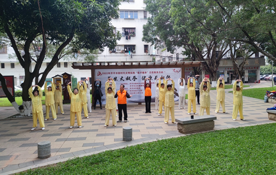 為倡導(dǎo)文明健康生活方式,提高廣大群眾體育健身意識,引領(lǐng)科學(xué)健身、文明健身、安全健身的全民健身新時尚,12月13日下午,由開平市新時代實踐志愿服務(wù)總隊、開平市衛(wèi)生健康局聯(lián)合舉辦的 “養(yǎng)生太極拳,健康長相伴”醫(yī)療健身志愿活動在東興社區(qū)小公園開展?;顒蝇F(xiàn)場共吸引20 名群眾積極參與。 伴隨著優(yōu)雅舒緩的音樂響起,群眾在志愿者的引領(lǐng)和指導(dǎo)下練習(xí)太極操。在練習(xí)期間,志愿者們更向大家詳細(xì)講解太極拳的基本動作、養(yǎng)生功法和傳統(tǒng)套路等,糾正和規(guī)范標(biāo)準(zhǔn)動作,并及時為參與活動的群眾答疑解惑。參與活動的群眾神情專注,潛心練習(xí),舒緩優(yōu)美的動作招式成為冬日東興社區(qū)小公園一道亮麗的風(fēng)景線。 通過開展此次活動,方便群眾在家門口就能接受專業(yè)的醫(yī)療健身服務(wù),豐富了群眾的健康生活,鼓勵和引導(dǎo)廣大群眾積極參加體育健身活動,使他們養(yǎng)成良好的體育鍛煉習(xí)慣。送去健康之余,更使中醫(yī)藥健康養(yǎng)生理念深入人心,同時也展示了開平市新時代文明實踐醫(yī)療健身志愿服務(wù)總隊的風(fēng)采。