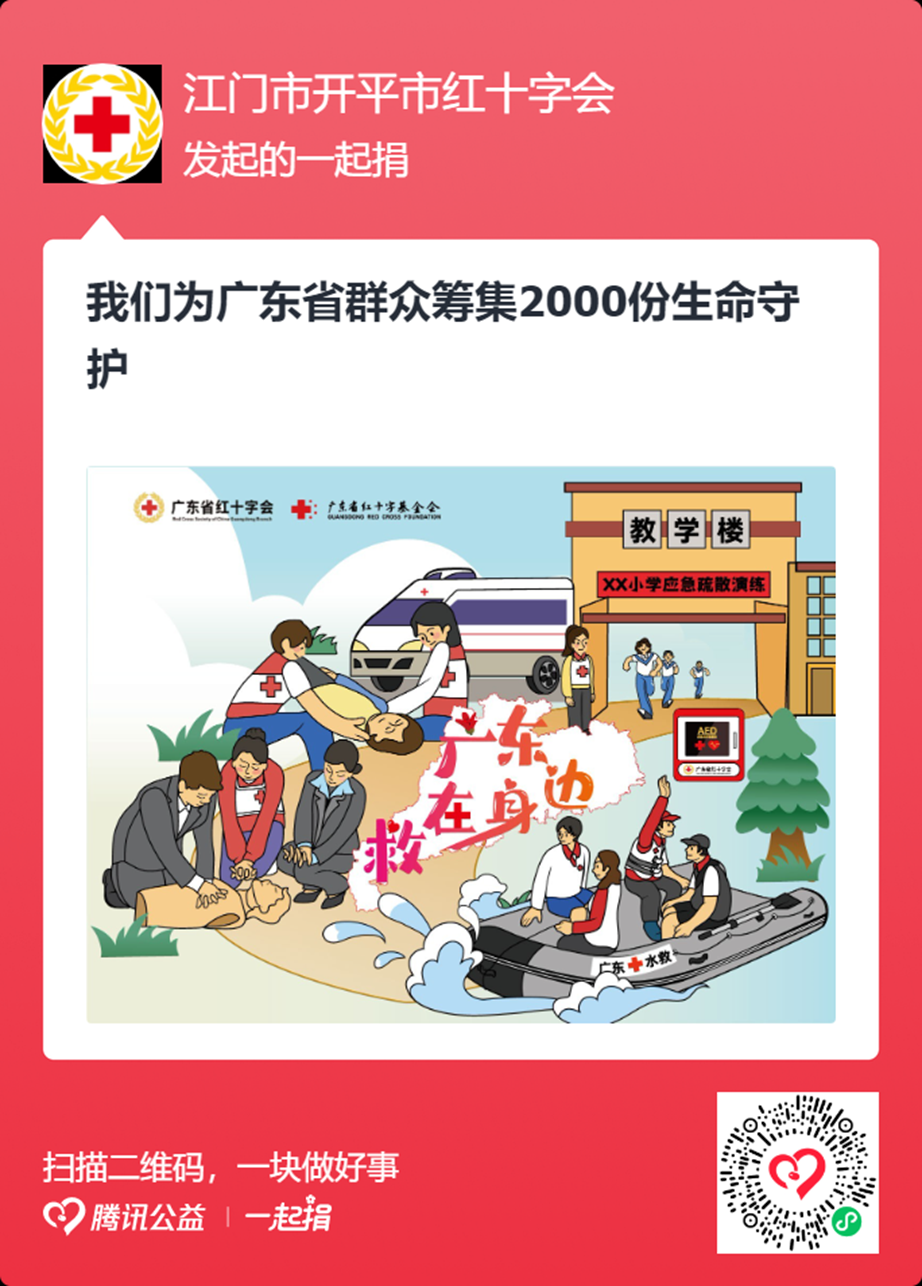 守護生命,救在身邊! 開平市紅十字會“5?8人道公益日”眾籌活動 倡議書 社會各界愛心單位、愛心人士、廣大市民: 5月8日是“世界紅十字日”,為弘揚“人道、博愛、奉獻”的紅十字精神,倡導(dǎo)“人人皆可參與”的公益理念,中國紅十字會總會發(fā)起“5?8人道公益日”眾籌活動。開平市紅十字會在廣東省紅十字會“廣東救在身邊”項目下組建“一起捐”隊伍,籌得款項將用于開展應(yīng)急救護知識和技能培訓(xùn),購置AED、急救包等急救設(shè)備或救援設(shè)備。 在此,我們懷著最真摯、最崇敬的心情向社會各界發(fā)出倡議:請您伸出溫暖的雙手,敞開仁愛的胸懷,加入到“5?8人道公益日”募捐活動中來!打開手機,動動手指,掃描下方小程序碼與“我們一塊做好事”!同時也請您轉(zhuǎn)發(fā)至朋友圈,發(fā)動更多愛心人士支持! 募捐時間:即日起至5月9日(其中5月7-9日每天早上10時開始,每筆1元以上捐贈,將有機會獲得隨機金額配捐,每人每天可獲配捐總額上限為999元。) 廣東省開平市紅十字會 2023年5月3日 我們鄭重承諾,將按照“公開、公平、公正、透明”的原則尊重捐贈者意愿,充分發(fā)揮紅十字的職能,實施“救在身邊”項目,管理使用好全部善款并接受第三方審計和社會監(jiān)督,及時向社會公布。 開具捐贈發(fā)票操作步驟 微信小程序搜索“騰訊公益”進入首頁——右下角點“我的”——更多記錄——我的捐贈票據(jù)——索取紙質(zhì)捐贈票據(jù)——選擇要開具票據(jù)的項目(廣東救在身邊)——點擊“查看詳情”并選擇對應(yīng)項目——填寫開票信息——確認提交(將由廣東省紅十字會財務(wù)開具電子發(fā)票發(fā)送至手機或郵箱) 愛心點燃希望,奉獻成就美好 讓我們一起積小善,成大愛! 愛的接力,讓這個世界更加溫暖!