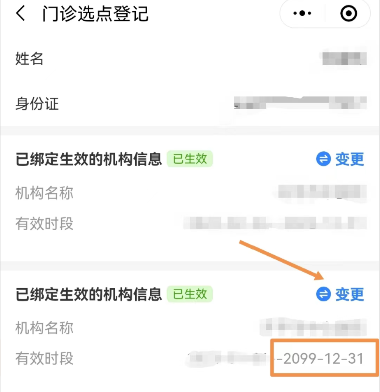 七、對目前有效且需要變更的門診定點(diǎn)醫(yī)療機(jī)構(gòu),點(diǎn)擊“變更”。