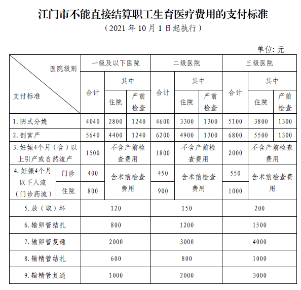 未辦理產(chǎn)前檢查就醫(yī)確認(rèn)手續(xù)、未按規(guī)定辦理變更產(chǎn)前檢查定點(diǎn)醫(yī)療機(jī)構(gòu)或因參保職工個(gè)人原因造成生育醫(yī)療費(fèi)用不能直接結(jié)算的,可以向參保地醫(yī)療保障經(jīng)辦機(jī)構(gòu)申請(qǐng)零星報(bào)銷,具體支付標(biāo)準(zhǔn)如下表。