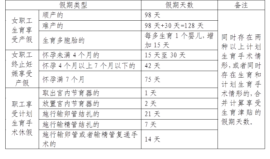 職工應(yīng)當(dāng)享受的生育津貼,按照職工生育或者施行計(jì)劃生育手術(shù)時(shí)用人單位上年度職工月平均工資除以30再乘以規(guī)定的假期天數(shù)計(jì)發(fā)。職工享受生育津貼的假期天數(shù),按照下列表格規(guī)定計(jì)算。