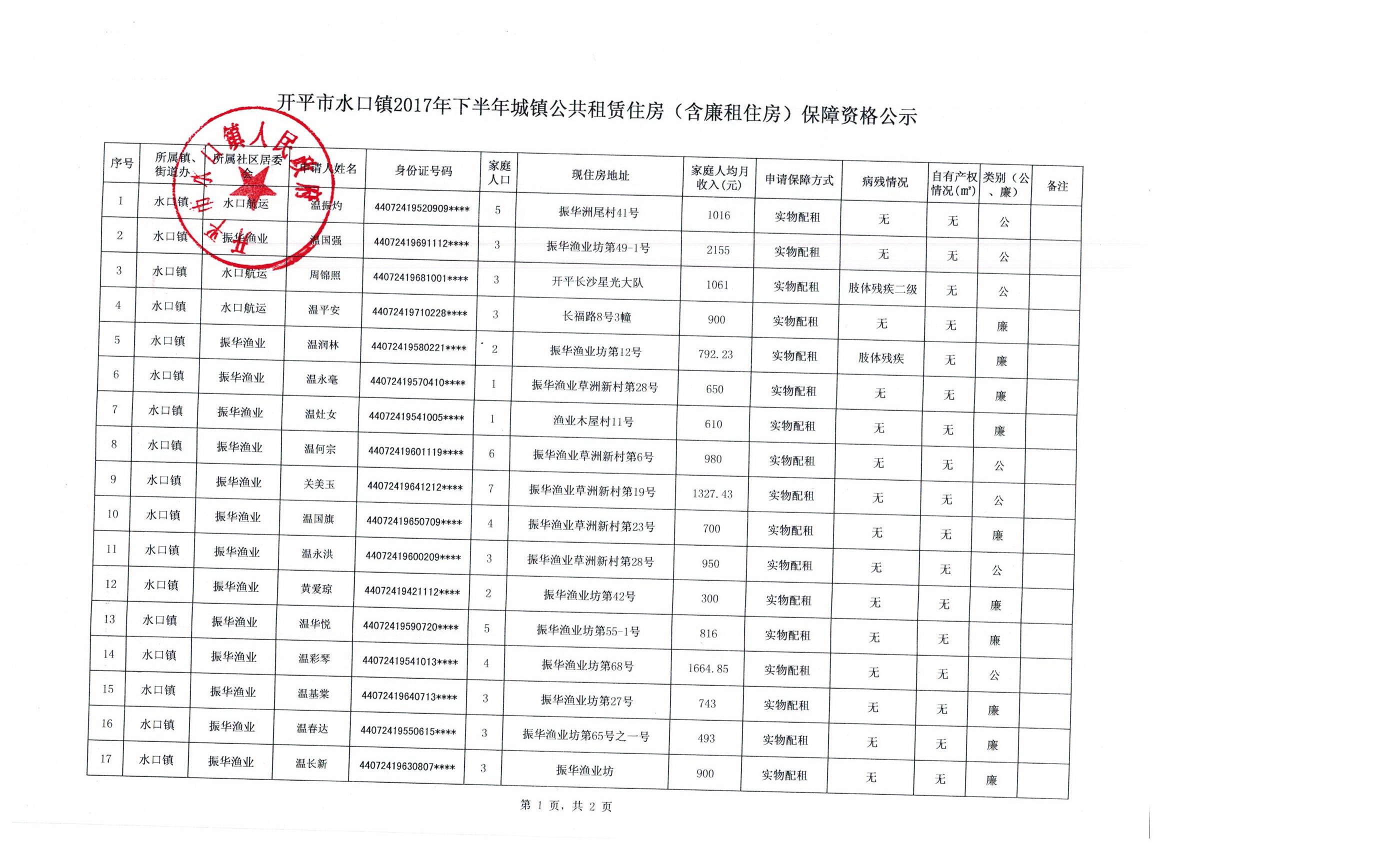 開平市水口鎮(zhèn)2017年下半年城鎮(zhèn)公共租賃住房(廉租住房)保障資格公示