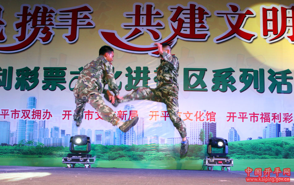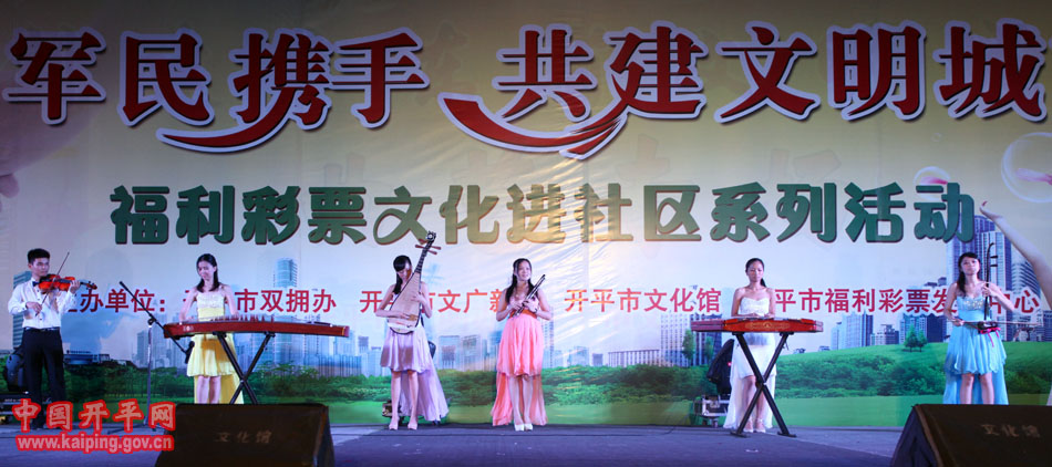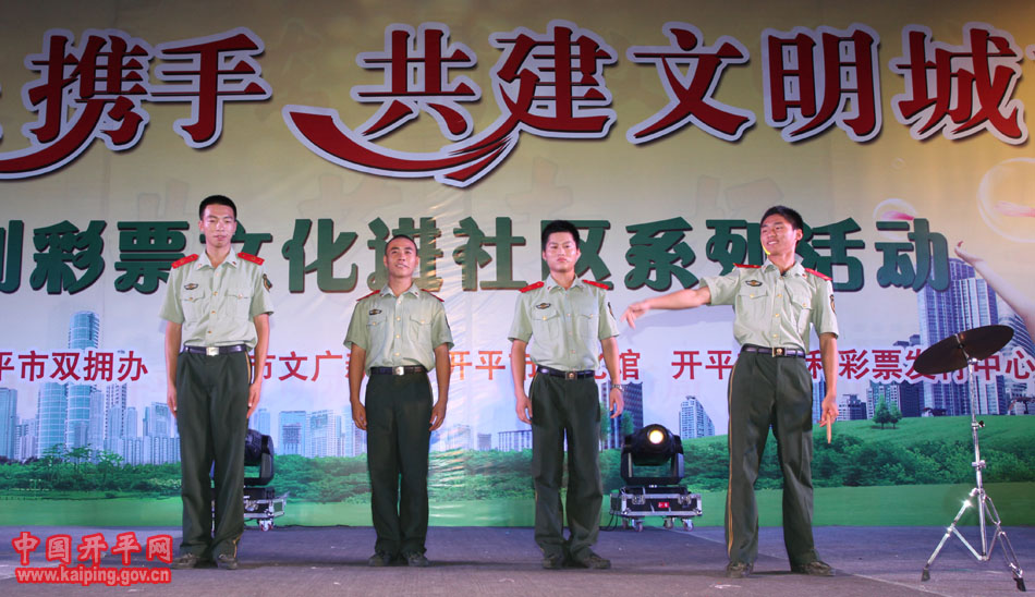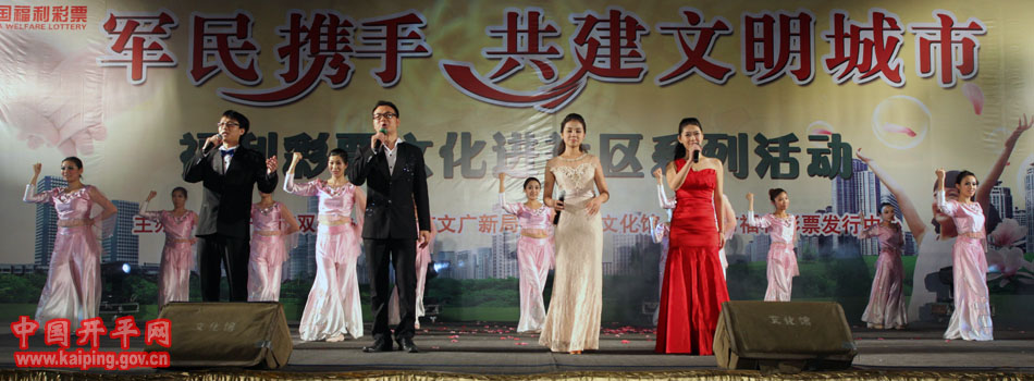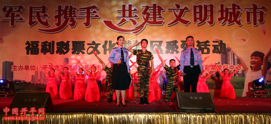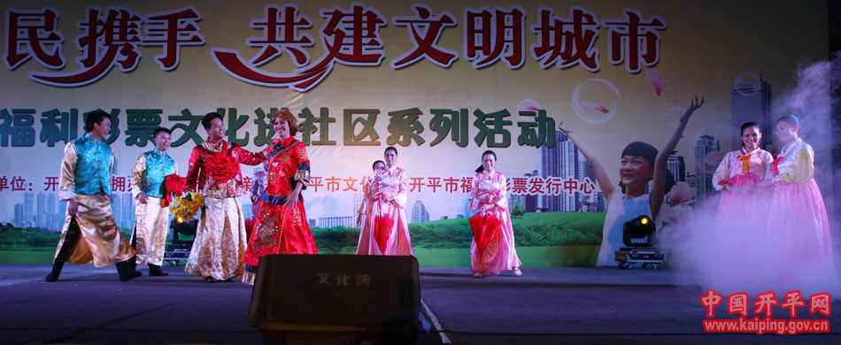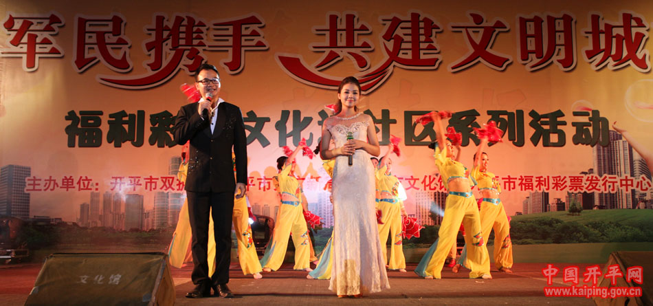 特別是在5日晚的“軍民攜手·共建文明城市—福利彩票文化進(jìn)社區(qū)系列活動(dòng)”中上演的開(kāi)平民歌《洋妹喜嫁開(kāi)平郎》,更是贏得現(xiàn)場(chǎng)觀眾的好評(píng)。該節(jié)目是用賣(mài)雞調(diào)、夾房歌、禾樓歌等豐富的開(kāi)平民歌音樂(lè)結(jié)合地方傳統(tǒng)婚慶禮儀,講述了美國(guó)姑娘洋妹與“開(kāi)平仔”在美國(guó)同窗四年,共同研究建筑史,在研討“開(kāi)平碉樓的保護(hù)工作”中志同道合,共諧連理,洋妹嫁到開(kāi)平來(lái)的故事,進(jìn)一步展現(xiàn)了開(kāi)平民歌深厚的文化底蘊(yùn)和開(kāi)平碉樓的迷人魅力。