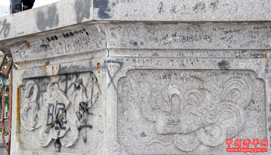 清洗人員通過用清洗槍對兩條龍鳳柱進(jìn)行沖洗后,再使用多種化學(xué)藥品配制而成的藥水對柱子上的亂涂亂畫字跡進(jìn)行噴灑清洗;然后,用專用洗刷用具對其進(jìn)行洗刷去污;最后,再用清洗槍進(jìn)行徹底清理。清洗后的兩條龍鳳柱煥然一新,顯示出更加清晰、干凈的效果。