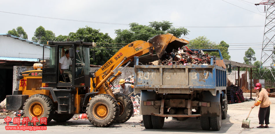 5月20日上午,開(kāi)平市逕頭垃圾中轉(zhuǎn)站地面垃圾堆積如山,環(huán)衛(wèi)工人用鏟車清理堆在地面的大量垃圾達(dá)5車。環(huán)衛(wèi)部門表示,本來(lái)這里每天僅收集1車?yán)?,?年來(lái),這里每隔10日左右就有一大堆垃圾倒?jié)M地,是逕頭居委會(huì)各村把收集的垃圾都倒到這里來(lái)形成的。