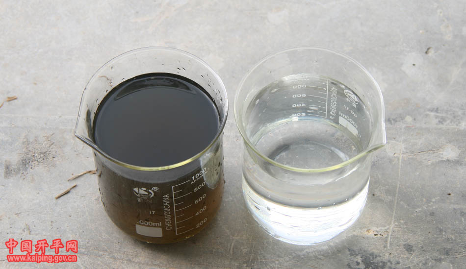 污濁的垃圾滲濾液(左)與經(jīng)處理后達到環(huán)保排放標準的清水(右)