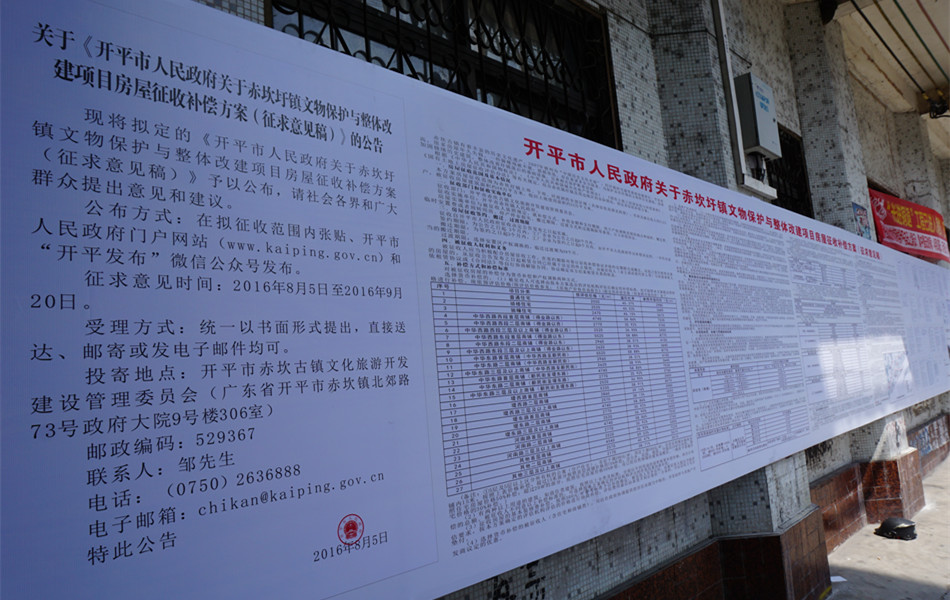 5日,《開平市人民政府關(guān)于赤坎圩鎮(zhèn)文物保護(hù)與整體改建項(xiàng)目房屋征收補(bǔ)償方案(征求意見稿)》對(duì)外公布,廣泛向社會(huì)各界征求意見和建議。