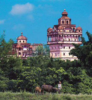 在中國(guó)的南海之濱,有著這樣一塊神奇的土地: ?。保福埃岸嘧跉v史傳統(tǒng)文化與萬(wàn)國(guó)風(fēng)情于一體的碉樓,她們歷經(jīng)了300多輪寒暑易節(jié),在從治到亂,從亂到治的反復(fù)交替中,以自己特有的風(fēng)姿,一座一座相繼拔地而起,巍然屹立于1600多平方公里的土地之上。 如今,她們,與青山綠水,與僑鄉(xiāng)文化,與現(xiàn)代化的城市群落,與純樸民風(fēng),與尋常的百姓生活融為一體——構(gòu)成了一座集華僑之鄉(xiāng)、建筑之鄉(xiāng)、文化藝術(shù)之鄉(xiāng)、碉樓之鄉(xiāng)之盛譽(yù),別具特色的嶺南山水園林僑鄉(xiāng)旅游城市。 ——這,就是正在以申報(bào)世界文化遺產(chǎn)的碉樓為品牌、以僑鄉(xiāng)風(fēng)情為主韻的,中國(guó)優(yōu)秀旅游城市的中國(guó)著名僑鄉(xiāng)——廣東省開(kāi)平市。(一)發(fā)揮優(yōu)勢(shì)繪藍(lán)圖 開(kāi)平,地處中國(guó)充滿經(jīng)濟(jì)活力的珠江三角洲西南部、中國(guó)第一僑鄉(xiāng)江門市的中心位置。開(kāi)平全市總面積1659平方公里,常住人口68萬(wàn),旅居世界67個(gè)國(guó)家和地區(qū)的僑胞75萬(wàn)人,有“海內(nèi)海外兩開(kāi)平”之說(shuō);開(kāi)平1649年建縣,1993年撤縣設(shè)市,現(xiàn)轄15個(gè)鎮(zhèn)和3個(gè)辦事處。市委、市政府所在地城區(qū)由三埠、長(zhǎng)沙、沙岡三個(gè)辦事處鼎足構(gòu)成,面積108平方公里,人口24萬(wàn)多。潭江、蒼江、茭江相伴,三水穿城而過(guò),被分隔的每個(gè)埠就像耀眼明珠,奇妙地鑲嵌在逶迤的三江之上。