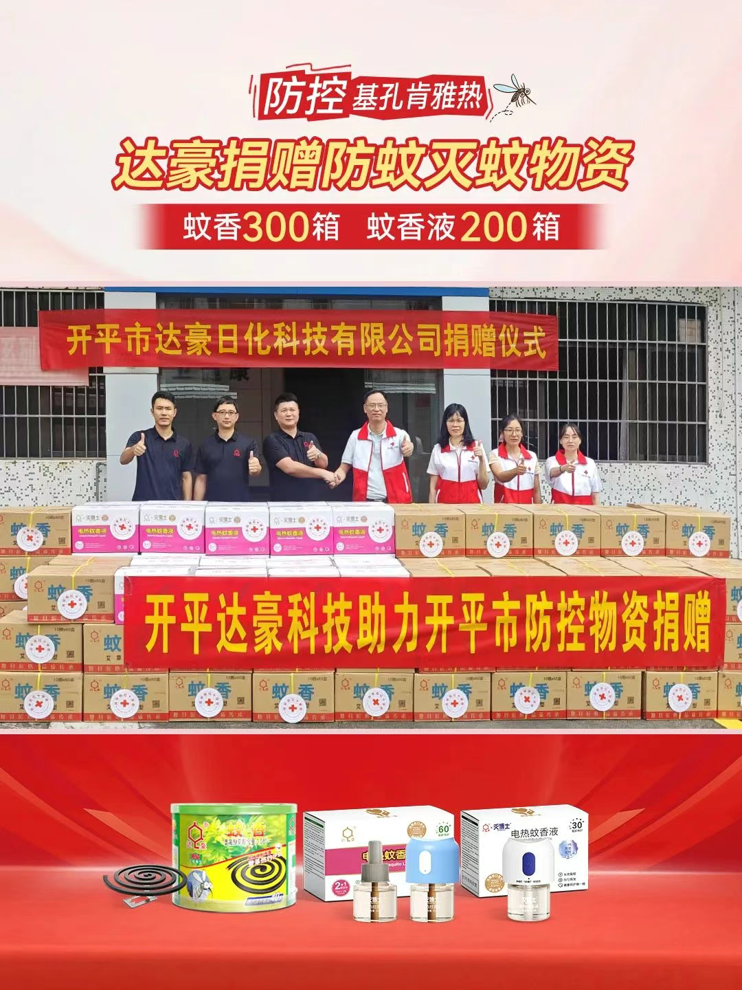 開平市達(dá)豪日化科技有限公司是一家專門生產(chǎn)銷售“除四害”產(chǎn)品的本土企業(yè),在獲悉開平市防蚊滅蚊需求后,積極對(duì)接相關(guān)職能部門,通過開平市紅十字會(huì)向開平市捐贈(zèng)了7500盒蚊香、1500盒電熱蚊香液,以實(shí)際行動(dòng)彰顯企業(yè)的社會(huì)責(zé)任與擔(dān)當(dāng)。