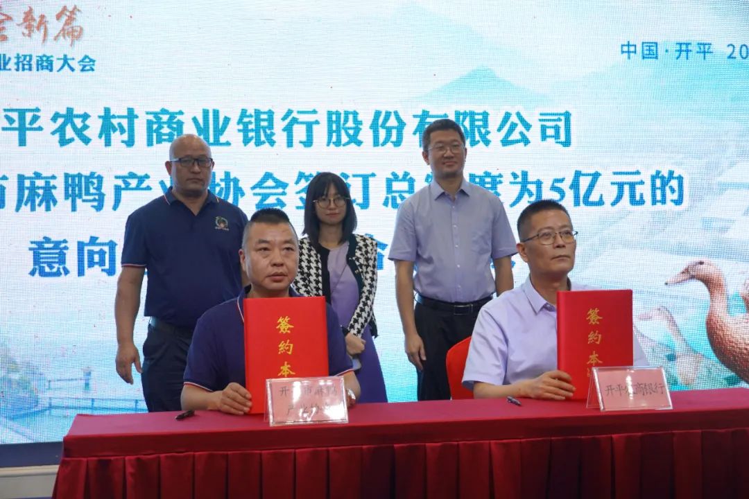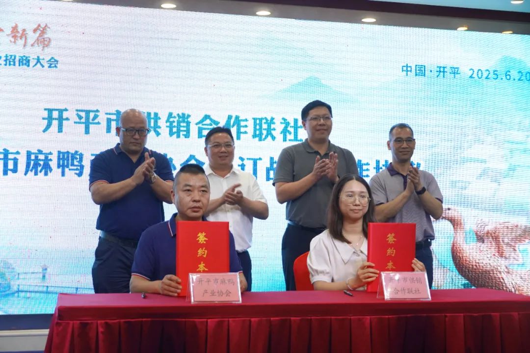 為加速推進(jìn)開平麻鴨產(chǎn)業(yè)向標(biāo)準(zhǔn)化、品牌化、規(guī)模化發(fā)展,大會聚焦市場化精準(zhǔn)招商,促成多項(xiàng)重要合作落地。會上,開平市赤水鎮(zhèn)人民政府分別與開平市旺禽科技孵化有限公司簽訂家禽孵化項(xiàng)目投資協(xié)議,與廣東省坤靈農(nóng)業(yè)科技有限公司簽訂禽蛋加工項(xiàng)目投資協(xié)議,與江門市軍葉食品有限公司簽訂農(nóng)產(chǎn)品深加工項(xiàng)目投資協(xié)議,三個項(xiàng)目總投資超1億元。開平市麻鴨產(chǎn)業(yè)協(xié)會分別與開平市供銷合作聯(lián)社簽訂戰(zhàn)略合作協(xié)議,與開平農(nóng)村商業(yè)銀行股份有限公司簽訂總額度為5億元的意向性授信戰(zhàn)略合作協(xié)議。此外,為學(xué)習(xí)先進(jìn)經(jīng)驗(yàn),大會還邀請有數(shù)百年麻鴨養(yǎng)殖技藝與產(chǎn)業(yè)文化的“中國麻鴨之鄉(xiāng)”浙江省縉云縣人大常委會黨組書記、主任趙建銘到場作經(jīng)驗(yàn)交流。