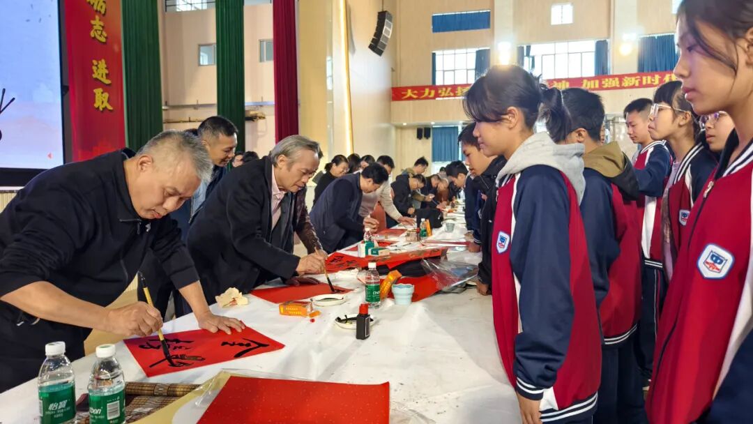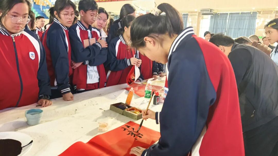 課堂結(jié)束后,開平市書法家協(xié)會、美術(shù)家協(xié)會等專業(yè)老師現(xiàn)場揮毫,為學(xué)生們呈現(xiàn)了一場“水墨交融”的藝術(shù)盛宴。學(xué)生們紛紛圍在老師身旁,近距離觀摩墨寶創(chuàng)作過程,感受傳統(tǒng)藝術(shù)的獨特魅力。